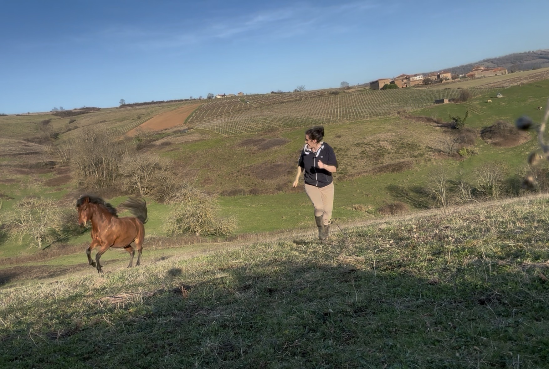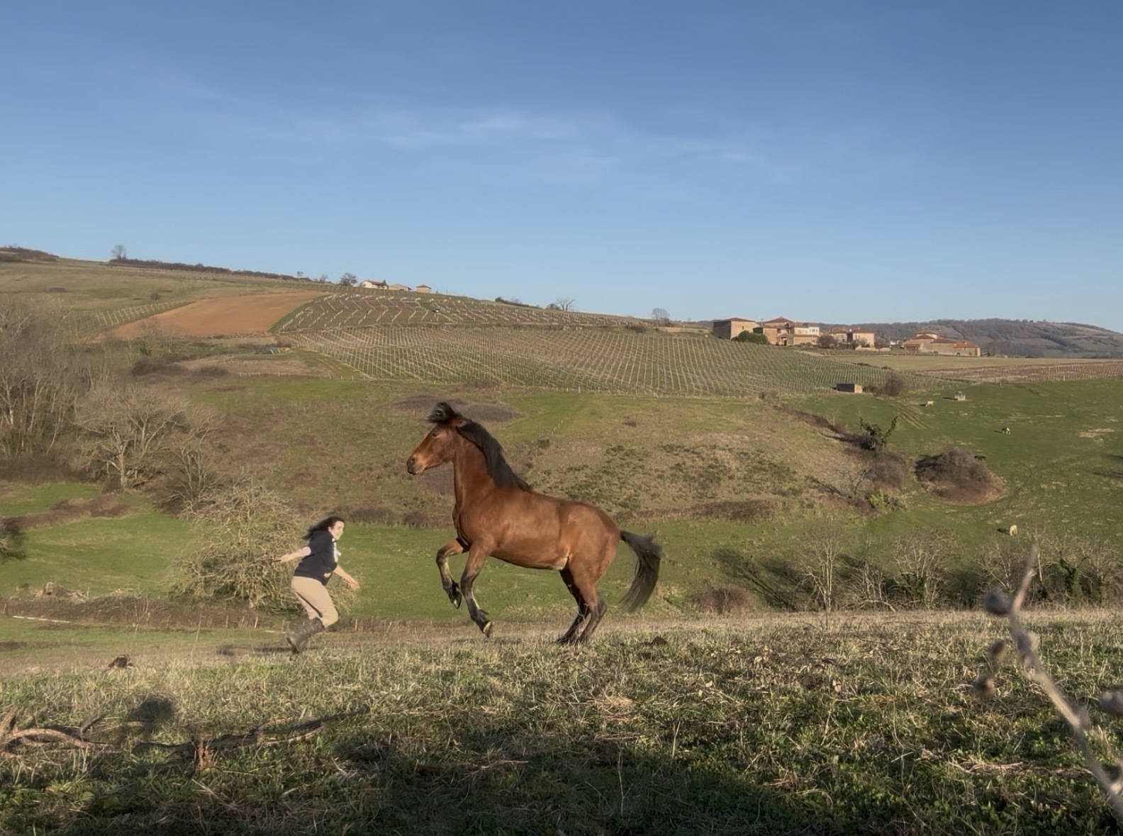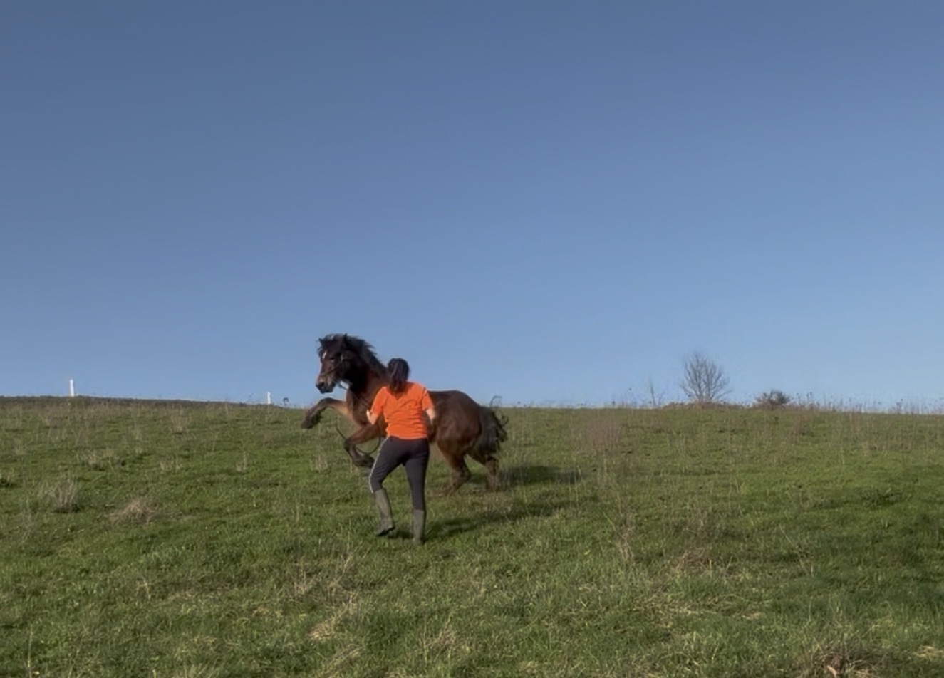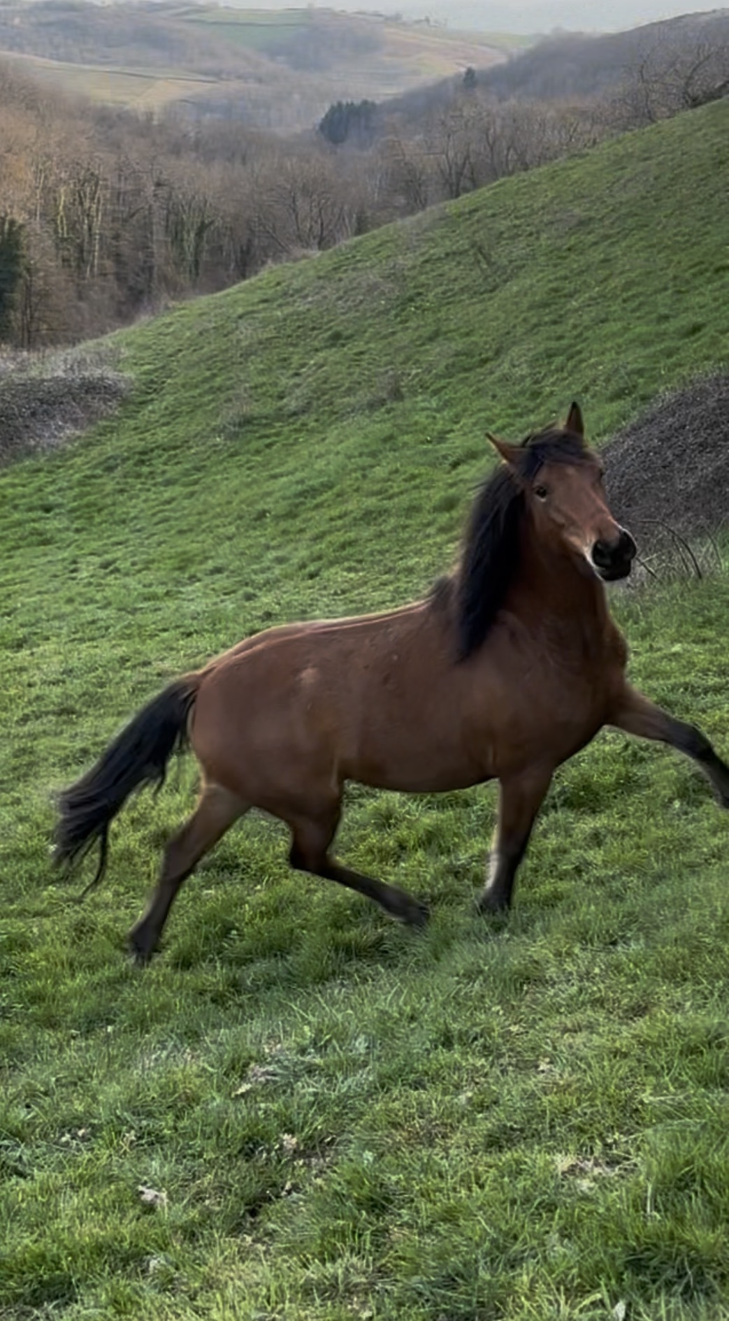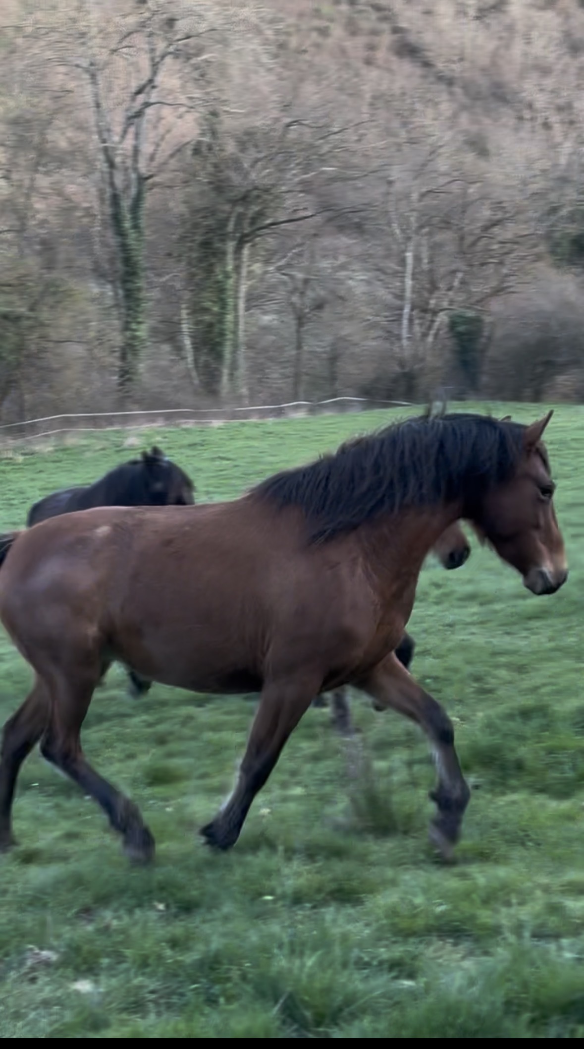 | Dire merci | Ensuite Nightcall. Elle m'épate sous tous les angles... quand je pense que je la vendais 4000€ et qu'elle n'est pas partie, je ne m'en remets toujours pas et à la fois je suis vraiment contente de ce concours de circonstances. Pour une juste 3 ans elle est incroyable. On dirait une 5-6 ans, elle fait vraiment finie, ronde, magnifique avec ses crins frisés. Et au quotidien, elle n'a rien à envier à mes adultes. Elle ne regarde rien, elle passe partout, elle est très fine, bouge vite et bien. On la prend dans le pré, on l'emmène sur la route derrière le quad. Même pas besoin de regarder ce qu'elle fait ni où elle est, car elle est toujours où il faut comme il faut quel que soit le terrain ou la vitesse. Vraiment elle est pétrie de qualités et ça me laisse entrevoir de belles choses quant aux futurs poulains de Jane même si son retour à la repro n'est pas encore d'actualité Les photos sont issues de vidéos visibles sur Facebook, elle bouge comme un chat pourtant le terrain est en mega pente |