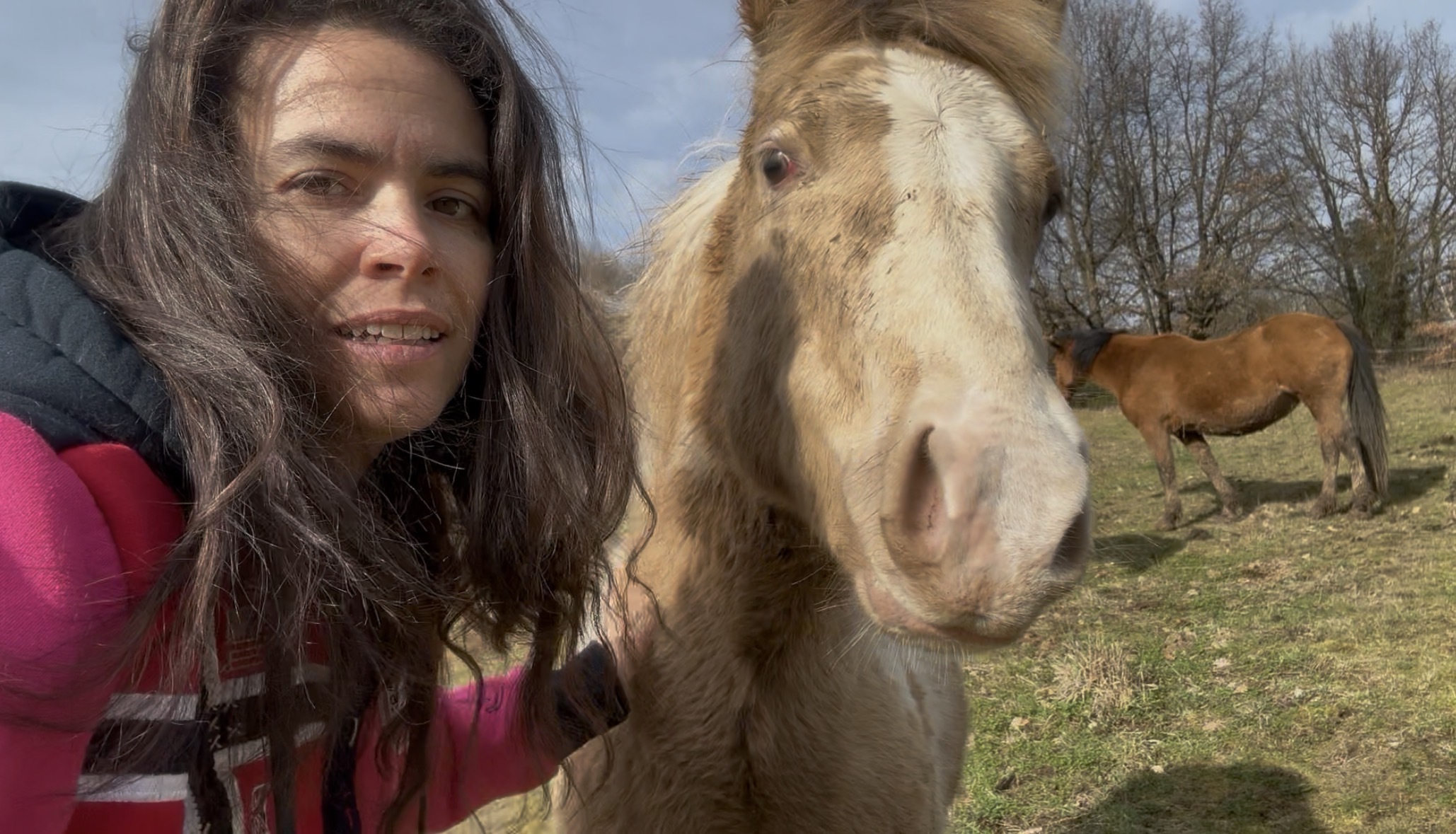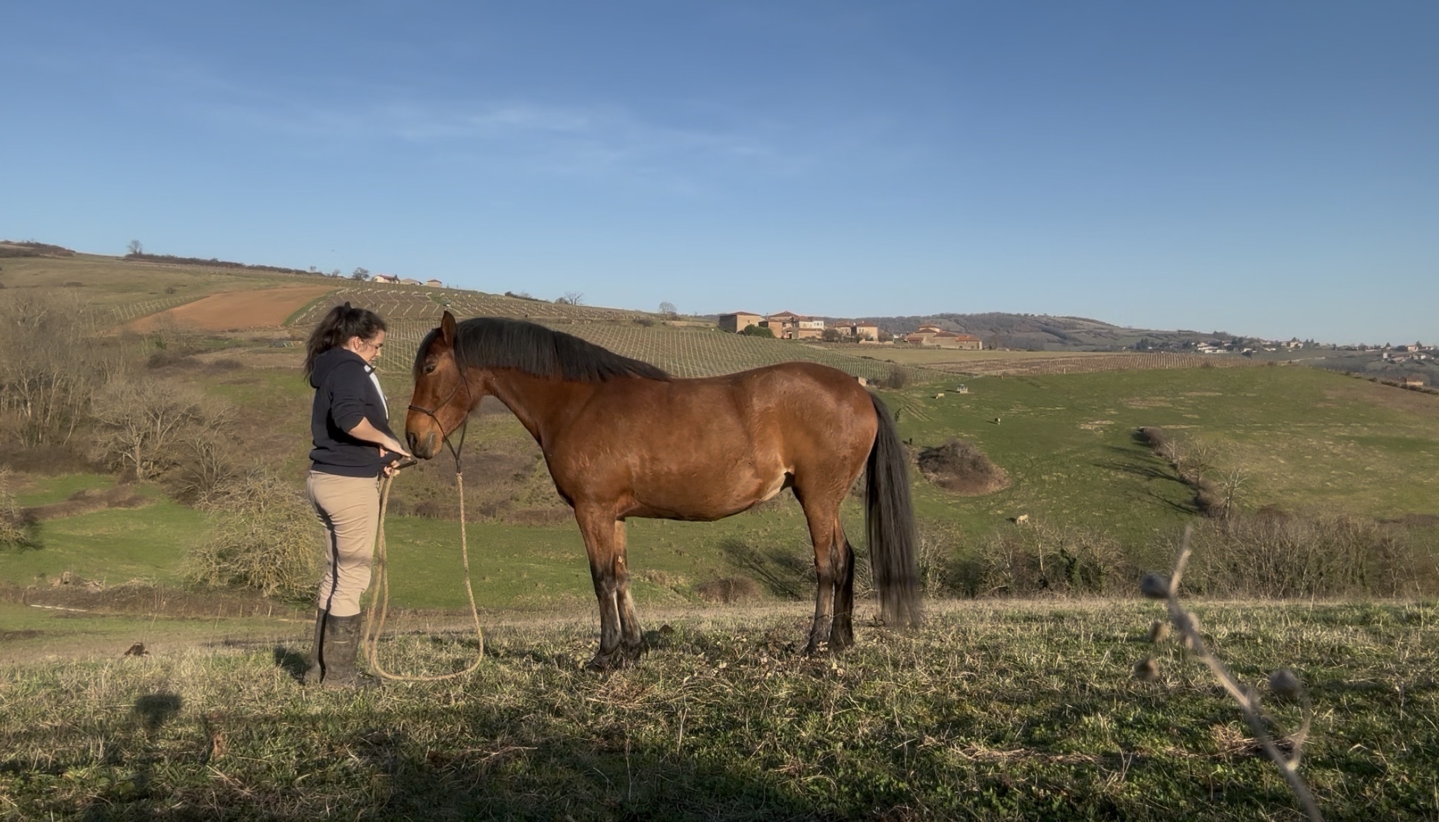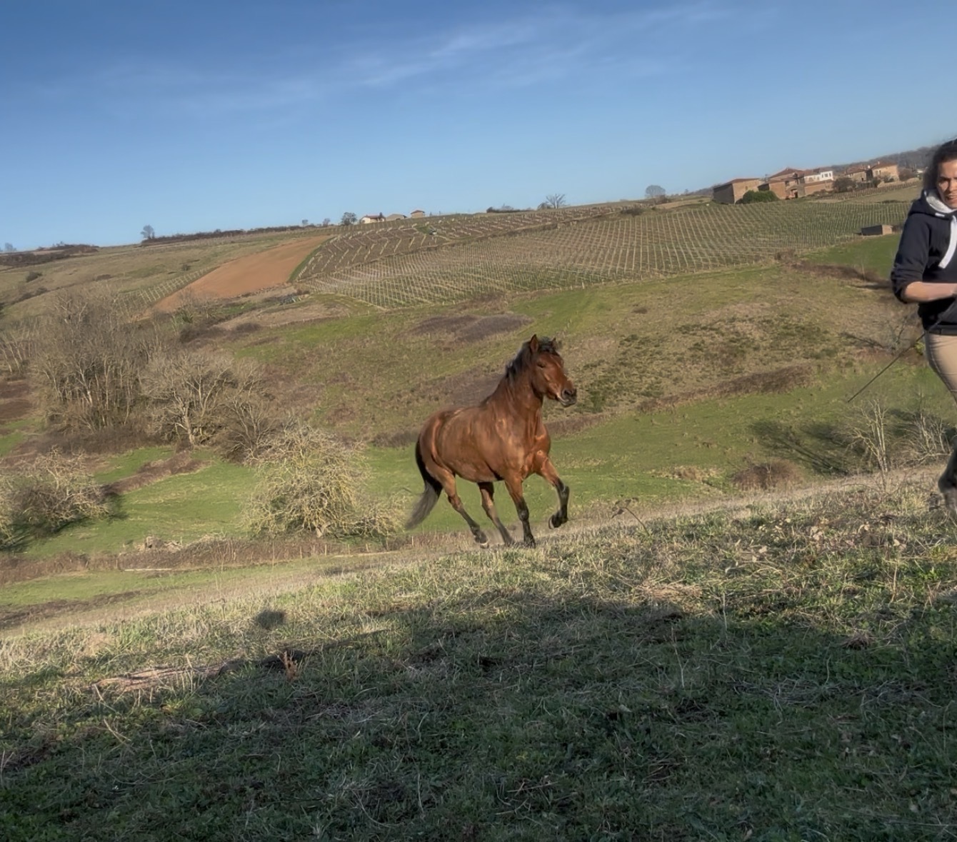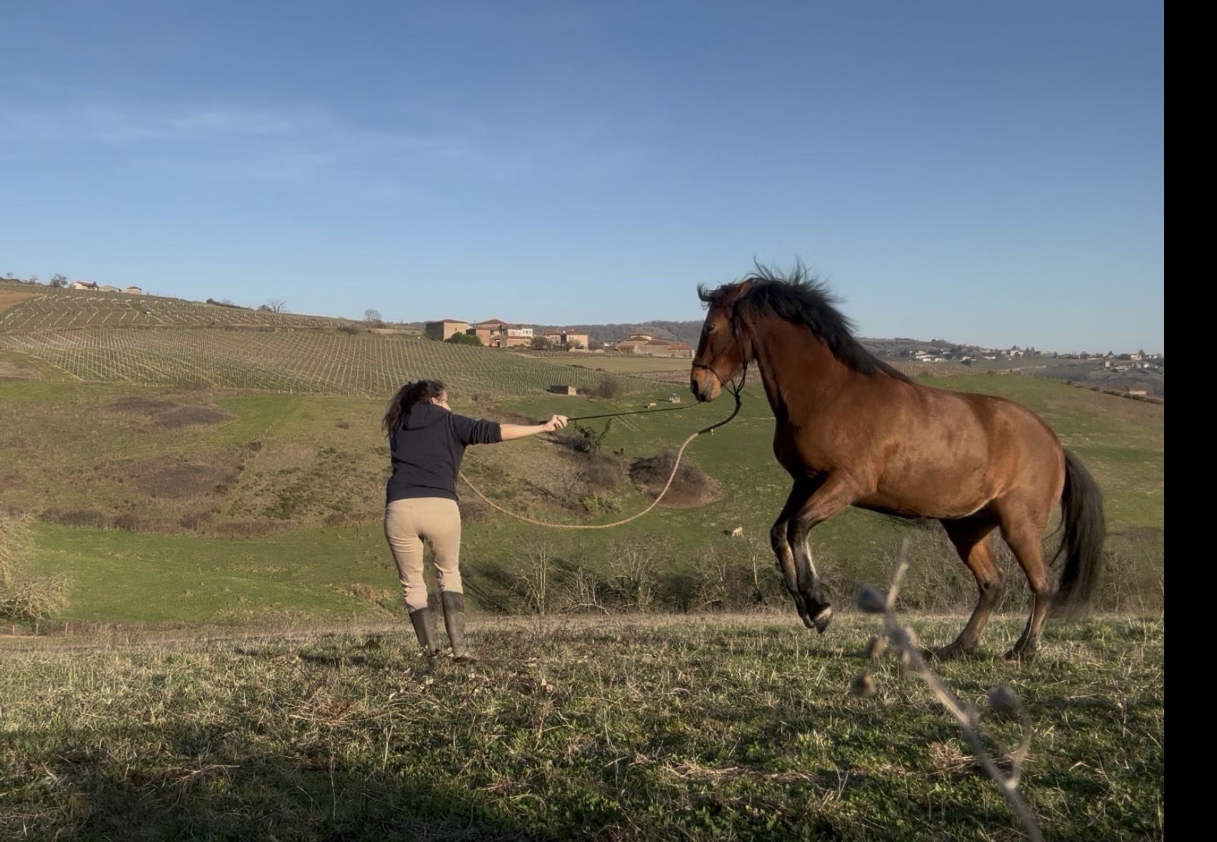 | Dire merci | Ensuite Nightcall. Elle m'épate sous tous les angles... quand je pense que je la vendais 4000€ et qu'elle n'est pas partie, je ne m'en remets toujours pas et à la fois je suis vraiment contente de ce concours de circonstances. Pour une juste 3 ans elle est incroyable. On dirait une 5-6 ans, elle fait vraiment finie, ronde, magnifique avec ses crins frisés. Et au quotidien, elle n'a rien à envier à mes adultes. Elle ne regarde rien, elle passe partout, elle est très fine, bouge vite et bien. On la prend dans le pré, on l'emmène sur la route derrière le quad. Même pas besoin de regarder ce qu'elle fait ni où elle est, car elle est toujours où il faut comme il faut quel que soit le terrain ou la vitesse. Vraiment elle est pétrie de qualités et ça me laisse entrevoir de belles choses quant aux futurs poulains de Jane même si son retour à la repro n'est pas encore d'actualité Les photos sont issues de vidéos visibles sur Facebook, elle bouge comme un chat pourtant le terrain est en mega pente |