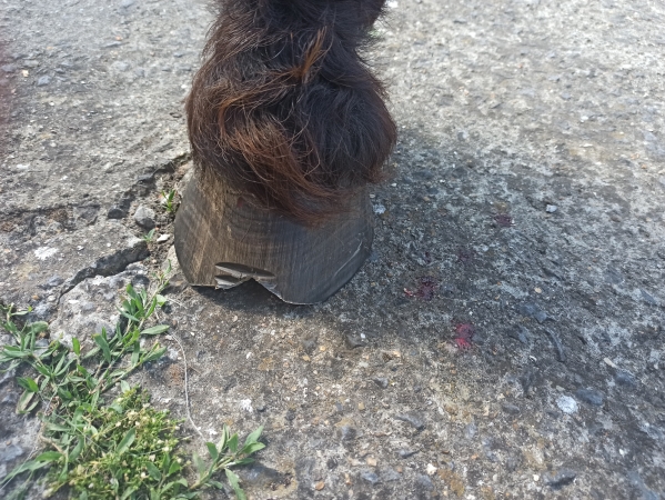| Dire merci | Bingo lony c'était bien un bouchon avec une fourmilière en-dessous. J'ai attaqué le pied à la râpe et j'ai vu que le "bouchon" était plus tendre que prévu, donc j'ai sorti la rénette. C'était jaunâtre avec une odeur bizarre comme du fromage (miam) et en-dessous la purée noire qui pue typique de la fourmilière. J'ai gratté un maximum de noir + taillé la pince autant que possible aussi bien pour lui que pour moi. J'ai dû m'y reprendre un paquet de fois, et il a été bien cool. Heureusement que ma mère a fait l'assistante aussi. Du coup là il reste une petite fissure noire, mais j'ai enlever bien 'équivalent d'un grain de raison de noir. J'ai passé une seringue d'eau oxygénée dedans sans que ça ne mousse vraiment (et je me suis piqué le pouce avec la seringue en passant, pas grave, je m'étais déjà mis un coup de rénette )Du coup le visuel du pied est moche, mais au moins ça a bien assaini. Je mets des photos ensuite ; je crois qu'il y a des taches de sang au sol, mais c'est mon pouce, pas le poney. Pas d'inquiétude, tout le monde va bien Je vais voir pour retailler ça mieux aussi à mesure des soins.J'ai aussi été ravi de gratter un bouton sur son fourreau...qui était une joli petit nid d'oeufs de mouche Proprement dégueulasse (taille d'un petit poids)(bon et ma bagnole aussi a décidé d'avoir une seime, ravi de voir mon pneu à plat juste avant de repartir, quelle poisse) ![]() On voit que le trou en triangle parait impressionnant, mais c'est quasi que de la paroi en trop, ça se voit mieux sur la photo suivante ![]() Là on voit bien le jaune de l'espèce de bouchon de kératine. Et la fissure de ce qui reste et que je vais continuer de soigner/surveiller/éventuellement creuser |