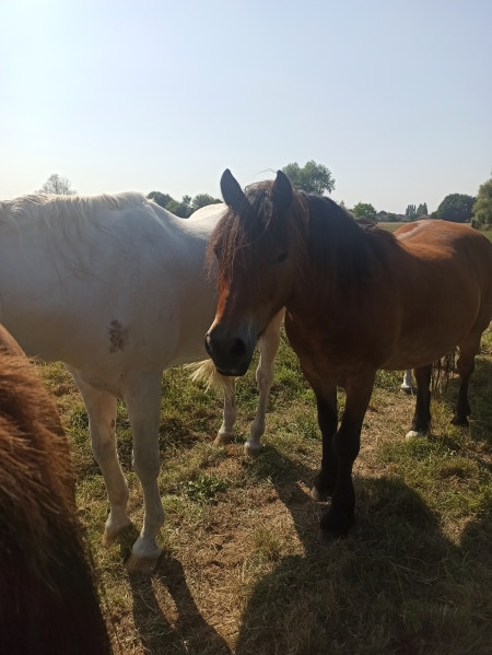 | Dire merci | Hello tout le monde ! Depuis le temps, un petit post de présentation de ma troupe me paraît judicieux. Vous allez vite voir que : 1. Je suis nase en photos 2. Je suis mal équipé en plus. 3. J’en prends rarement. Mais bon, j’ai envie de vous parler de ma troupe, et aussi de tenir un journal en quelque sorte vue que ma (notre, avec ma mère) spécialité est de récupérer des laissées pour compte, des moches, des vieux, des cassés. Ça vaut son pesant de cacahuètes en matière de prise de tête et de galères, mais aussi de grandes joies. Bref, la suite au post suivant. C’est qu’il y a du monde quand même ! Comme je vais détailler pas mal, je résumé ici ma clique : Neigeoux, Linda et Chicco : Trois poneys retraités dont le boulot est d’avoir la belle vie. Arrivés dans ma vie en 2001, 2013 et 2014, et nés en 1986, 1993 et 1979 (ou 80). Mon formidable Neigeoux nous a quittés le 22/06/2022, et mon gentil Chicco le 5/12/2023. Linda a rejoint Coco le 14/01/25 V.Ron : le belge, paint horse gentil neuneu, de 2007, pré-retraite pour arthrose des jarrets, fait de la balade de temps en temps. Arrivé le 20 novembre 2015 Cawr : le gallois, poney Welsh Cob ultra flippé, de 2009. Majoritairement du travail à pied. Arrivé le 1er avril 2014 Baron : le bulgare, poney D ONC, de 2007, très gentil sous la selle, très spécial à pied. Le seul vraiment au travail qui ne soit ni un retraité, ni un sauvetage. Arrivé le 1er novembre 2016 Grimm : Arrivé le 15 avril 2019, soit pile poil le jour de ses 3 ans (né en 2016). Welsh B qui a tout à apprendre encore (photos en page 21) Brigand : 28 ans, pas à moi mais à une amie, compagnon de longue date (21 ans de vie commune !) à la retraite chez moi. (Mon gentil Bibi nous a quitté le 11/09/19) Message édité le 26/04/25 à 19:03 |