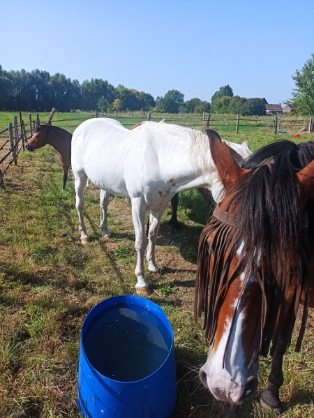 | Dire merci | J'ai tenté de faire des photos, mais alors c'est vraiment ce que j'appelle un jour blanc pour moi (trop de lumière, je ne vois que les contours des choses dans un flou blanc global) On avait 35°c là, inutile de dire qu'on s'en est tenus à de l'inspection globale et de la surveillance de l'eau, mais bon, ils ont l'air de bien supporter. En tout cas, ils restent en plein cagnard au lieu de s'abriter . D'abord Baron qui me suis partout dans tout ce que je fais, il participe toujours quand je bricole ![]() J'ai tenté de prendre le groupe en photo en me mettant sur une espèce de petite éminence du terrain... Bon... ![]() Et j'ai fait le tour pour prendre Cawr la baleine parce que je savais qu'il était derrière V.Ron, même si je ne le voyais pas, étant à contre-jour ![]() Ils m'ont fait rigoler à s'évertuer à vider le bidon d'eau que je tentais de remplir alors que l'autre était plein. (preuve à l'appui en photo, tiens) On a aussi deux pensionnaires réguliers, là pour 3 semaines, et on s'est cassé la tête pour que tout le monde ait accès à des abris...personne n'y va Moi comme un con, j'avais oublié qu'on avait changé les pensionnaires de parcelle, donc j'ouvre la porte de la pâture, qui est dans le box qui communique entre l'écurie et l'extérieur, et comme d'hab, je l'ai laissé ouvert. Sauf que c'est l'abri des deux-là justement. Moi au bout du bout du terrain avec les miens, j'appelle ma mère pour lui dire d'envoyer l'eau, ce qu'elle fait, et elle tombe nez à nez avec le poney en pension dans la cour. Elle lui "mais qu'est-ce que tu fais là ? Retourne en pâture" bah le poney a obéi sans poser de question, l'air lui-même de se demander ce qu'il foutait là |