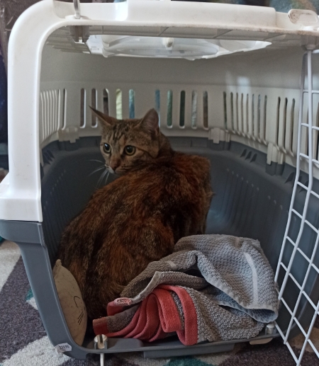 Je lui ai dit qu'on était d'accord et que c'était un sacré nom de merde.Sinon, voilà, je suis allé chercher Aline à l'appart de sa FA. Le gars l'avait déjà mise dans une caisse, sinon ça aurait été impossible de l'attraper en notre présence. Le transfert de caisse a été fun d'ailleurs, il a fallu la "faire couler" dans la mienne Je ne l'ai pas entendue de la route, et là Juju n'a absolument rien calculé, mais il y a de quoi vu que l'autre s'est bien planquée On va lui foutre la paix et voir ce que ça donne dans quelques jours.Elle est ultra jolie en tout cas, une très belle couleur blond roux pas très flagrante avec ma photo pourrie à suivre. La blague aussi c'est qu'on a tellement bien papoter avec la nana de l'asso que j'ai oublié de payer ça va se régler hein, mais j'y ai pensé pile poil quand mon GPS m'a emmené dans un chemin de terre tout pourri devant un centre équestre, je me voyais pas faire demi-tour.![]() |
