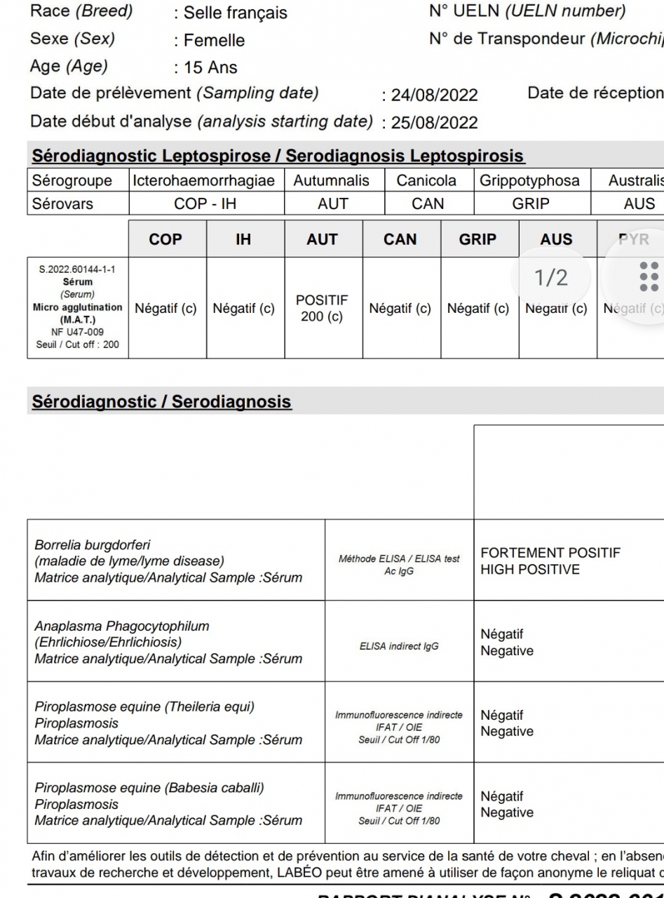 DéconnectéDire merci | dilou carodadou je ne sais pas si c'est une question de labo ou de protocole ou encore autre chose. Pour ma véto c'est en effet en fonction du taux d'anticorps qu'elle décide du traitement vu que nombre de chevaux sont positifs et ont des anticorps sans pour autant être malades. Pour les humains, je n'ai eu droit (aux Pays-bas) qu'au test anticorps (pos) plus Elisa(pos) plus Western blot (neg) mais j'aurais bien aimé connaître justement le taux d'anticorps pour voir s'il avait varié entre deux PS après l'apparition d'un erythème...mais hélas. J'ai donc fini par me faire soigner selon le protocole véto qui est plus au point. |