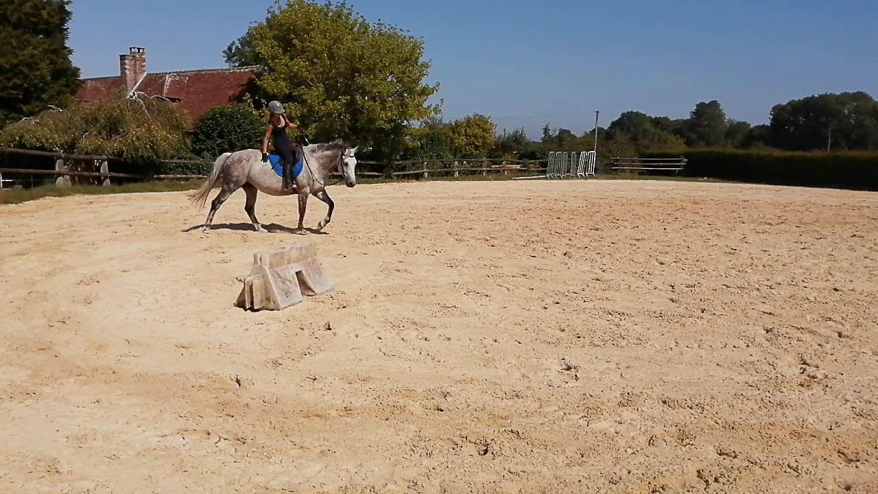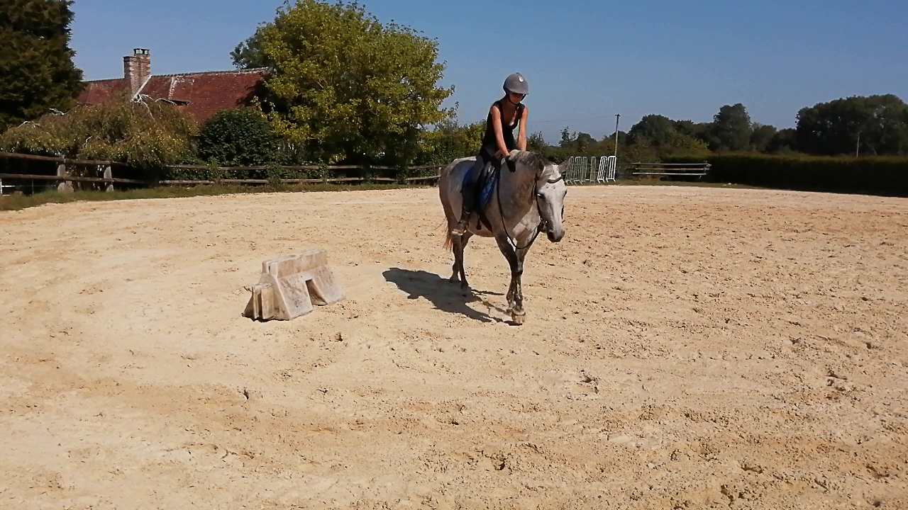 | Dire merci | Donc on a commencé au pas, droite des épaules et en avant le plus possible, c'était pas mal. Au pas c'est rarement la cata mais très difficile qu'elle vienne se tendre, s'appuyer. Mon rêve serait même qu'elle tire sur la main mais même quand elle "embarque" elle ne tire pas.![]() ![]() On a fait des huit, des épaules en avant, quelques cessions mais elle se tortille absolument dans tous les sens c'est pas la peine. J'ai mis sur un cercle en pli et contre pli puis on a attaqué le trot. ![]() |