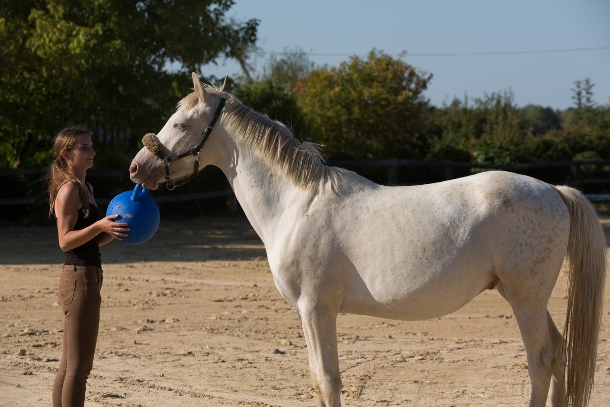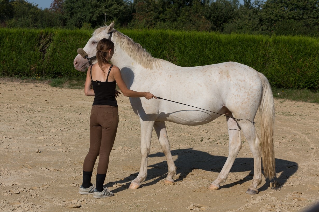 | Dire merci | Je e connais pas le jargon ostéo, mais sur les points cités en lombaires et cervicales, je ne suis pas surpris, je pense que ça colle au soucis de postérieur qui semble "mouliner" trop fort. Je pense que tu peux déjà faire du stretching aux antérieurs (pour T7 C6) et aux postéireurs (pour le reste) Mun bulgare avait un gros blocage à la jonction thoracique/cervicale, c''est assez fréquent en fait, met souvent pas bien grave. J'ai eu de supers résultats avec ostéo en séances rapprochées + stretching des antérieurs (et en bonus cadeau, une amélioration de notre relation très très conflictuelle à l'époque) Le mien avait aussi des "bananes" au niveau des pectoraux ascendants (un "triangle" au niveau du passage de sangle, un petit peu au-dessus des coudes) Je faisais des massages fermes et doux pour "dédurcir". Je suivais bien ses réactions pour ne pas forcer (idem pour le stretching) Si tu constates des petites bananes, n'hésite pas à les masser avec la pulpe des doigts, sans forcer, et en faisant des petits cercles. sur le stretching. règle numéro 1 : ,ne pas de faire shooter règle numéro 2, ne jamais forcer. Je décris vite fait, puis je te cherche une vidéo d'illustration. On va donc amener les antérieurs vers l'avant, un peu comme une jambette, en prenant d'une main ferme et pleine au-dessus du genou, le canon/sabot doit tomber librement, souple, pas de tension. C'est important d'abord de définir la position de confort : l'endroit où il ne veut pas reprendre son pied quand tu soulèves : Il y est bien, en équilibre. A chaque étirement, il faut revenir à cette position. S'il fait une résistance, il faut le laisser revenir à cette position. Il va sans doute galérer à comprendre, reposer son pied, on s'énerver. IL faut rester zen et neutre et amener à la position. Quand ils finissent par comprendre, ils kiffent bien en général. On va donc étirer l'antérieur vers l'avant. A terme, on peut avoir le pied en pointe, comme si le cheval montrait du doigt, mais c'est un peu comme nous quand on touche ses pieds sans plier les genoux, donc ça vient plus tard, après plusieurs séances (même s'il y a des chances qu'un bébé y arrive) Il y a donc cet étirement vers l'avant, pas longtemps, srtotu au début, à peine une poignée de secondes, et hop, position de confort, puis on recommence, une deux fois, et on fait l'autre jambe. L'autre exercie : on fait de petits ronds avec l'avant-bras vers l'avant, l'avant-bras à sa place. Bien sûr, on ne force pas et on n'écarte pas de ouf, mais on peut. Et enfin, tirer vers l'arrière. |