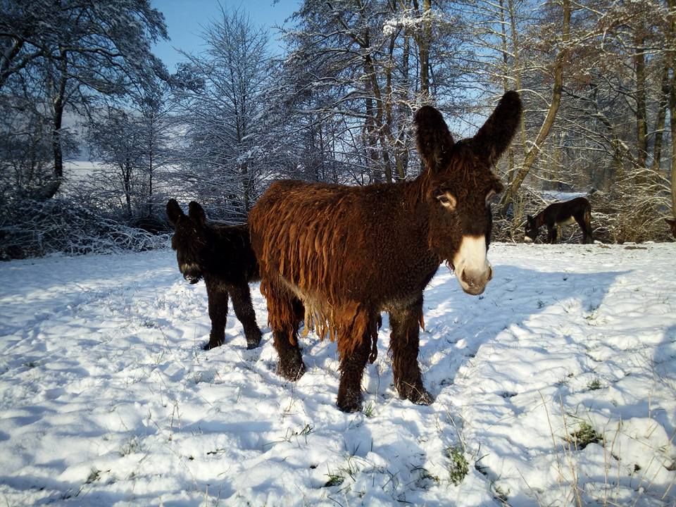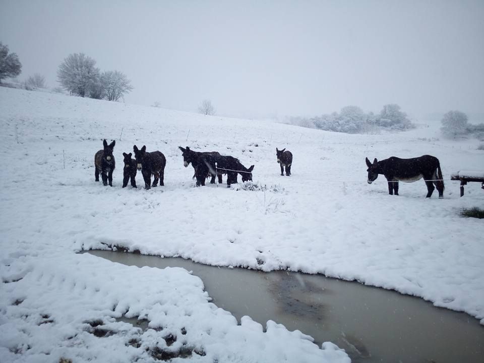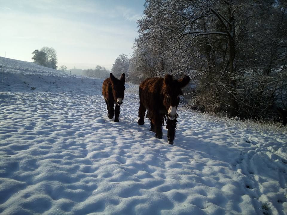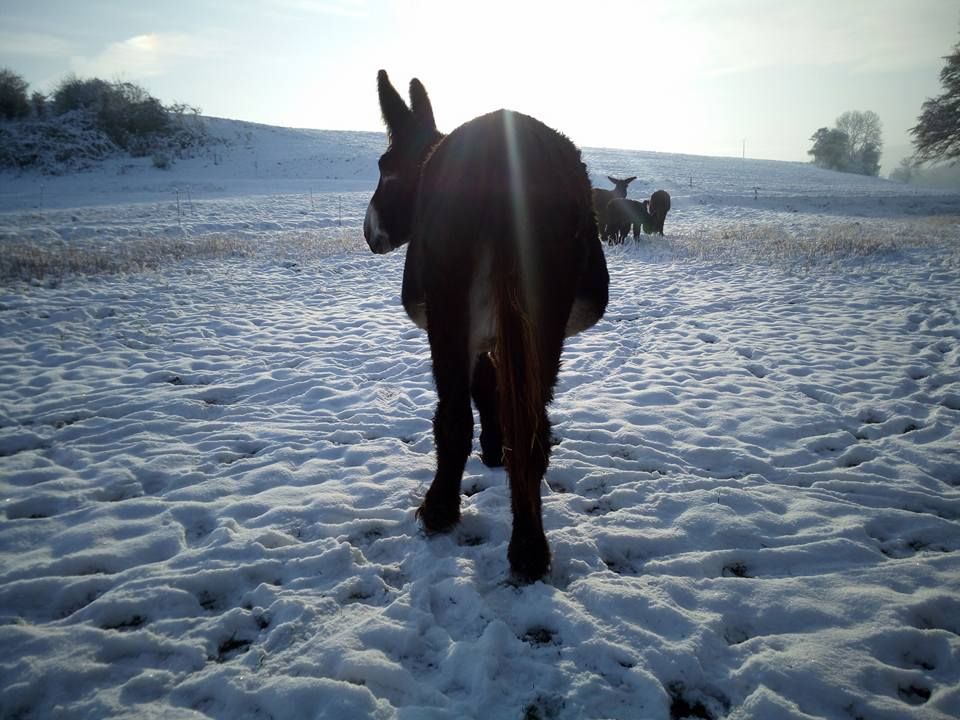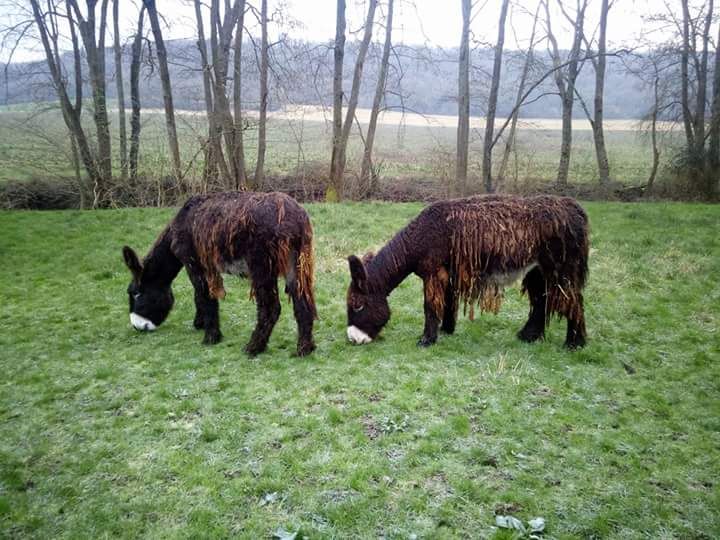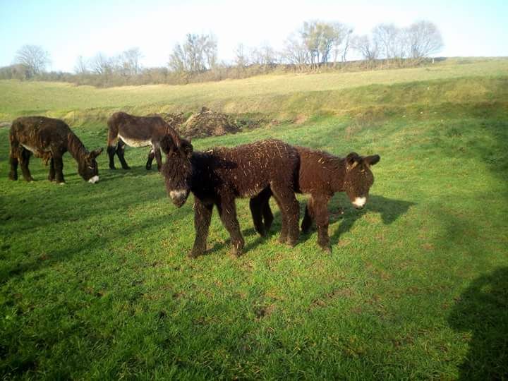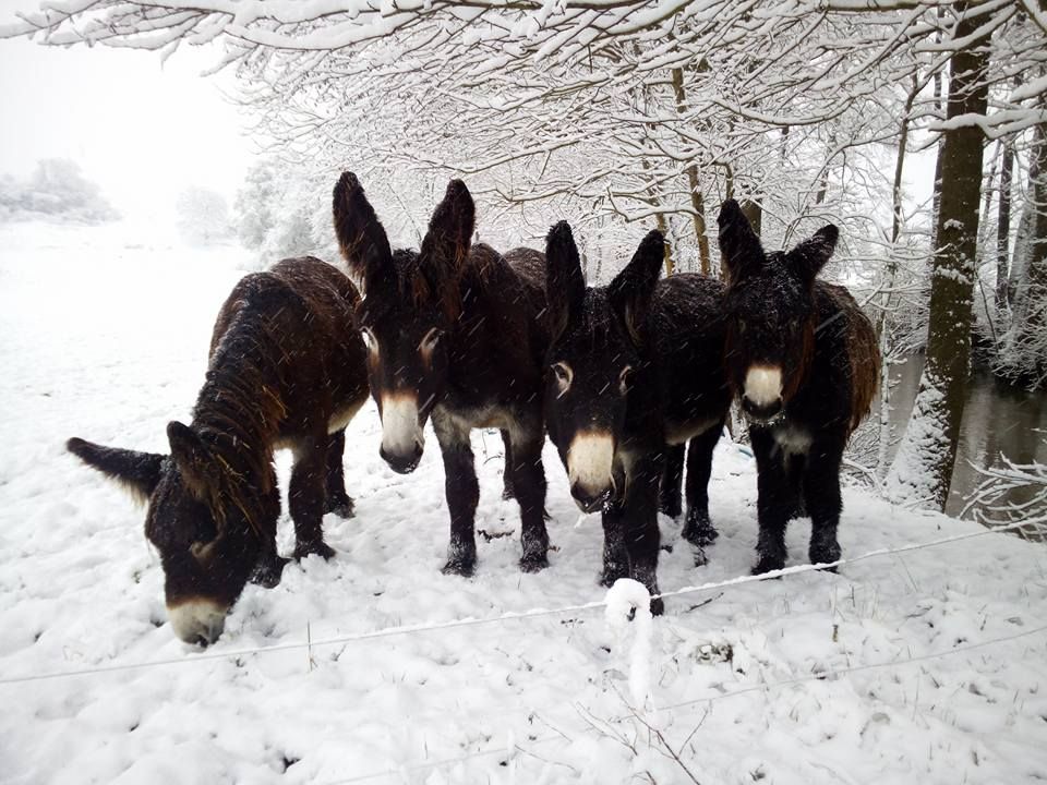 | Dire merci | Ça fait longtemps que je voulais faire un post pour mes grandes oreilles, voilà chose faite ! L'aventure a commencé il y a un peu plus de 2 ans, avec l'arrivée de 3 ânesses baudet du Poitou, dont une suitée d'un ânon de 6 mois. ![]() Les filles sont là pour un but précis : donner leur lait que je transformerais en savons et cosmétiques. L'histoire a mal commencé, une des ânesse pleine de 6 mois a avorté peu de temps après le transport. S'est ensuivi une année blanche avec 0 ânesse pleine fin 2016 malgré les services de 3 étalons différents. 2017 signe le retour de la chance avec 2 ânesses pleines en avril, une qui avorte et est de nouveau saillie fin juillet avec un résultat positif. Et 2018 annonce la consécration avec la découverte d'une 3eme ânesse pleine et une 1ere naissance imminente. Place aux photos prises en février ou nous avons eu qq jours de neige. ![]() ![]() ![]() ![]() ![]() Et les copains chevaux qui squattent la stabulation et les pâtures d'à côté ![]() ![]() Message édité le 07/03/18 à 13:14 |