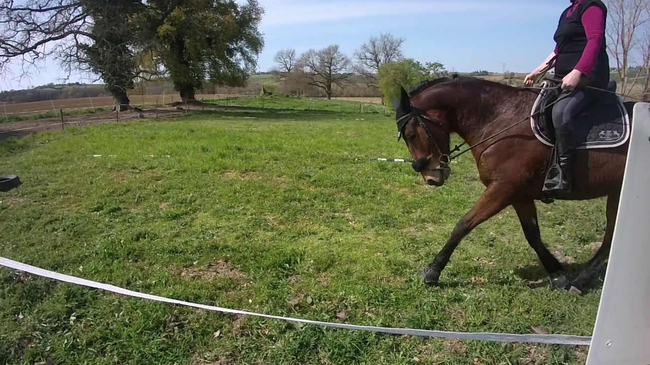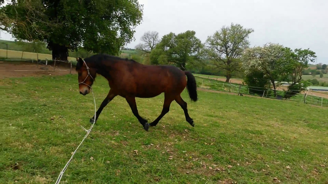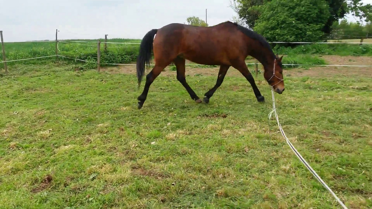 | Dire merci | e voici la petite vidéo de la fin de travail au galop où le cheval est dans une meilleure cadence, régularité et équilibre qu'au début que ce soit main gauche ou main droite mais c'est loin d'être parfait et il y'a beaucoup de travail encore pour moi et pour lui![]() |