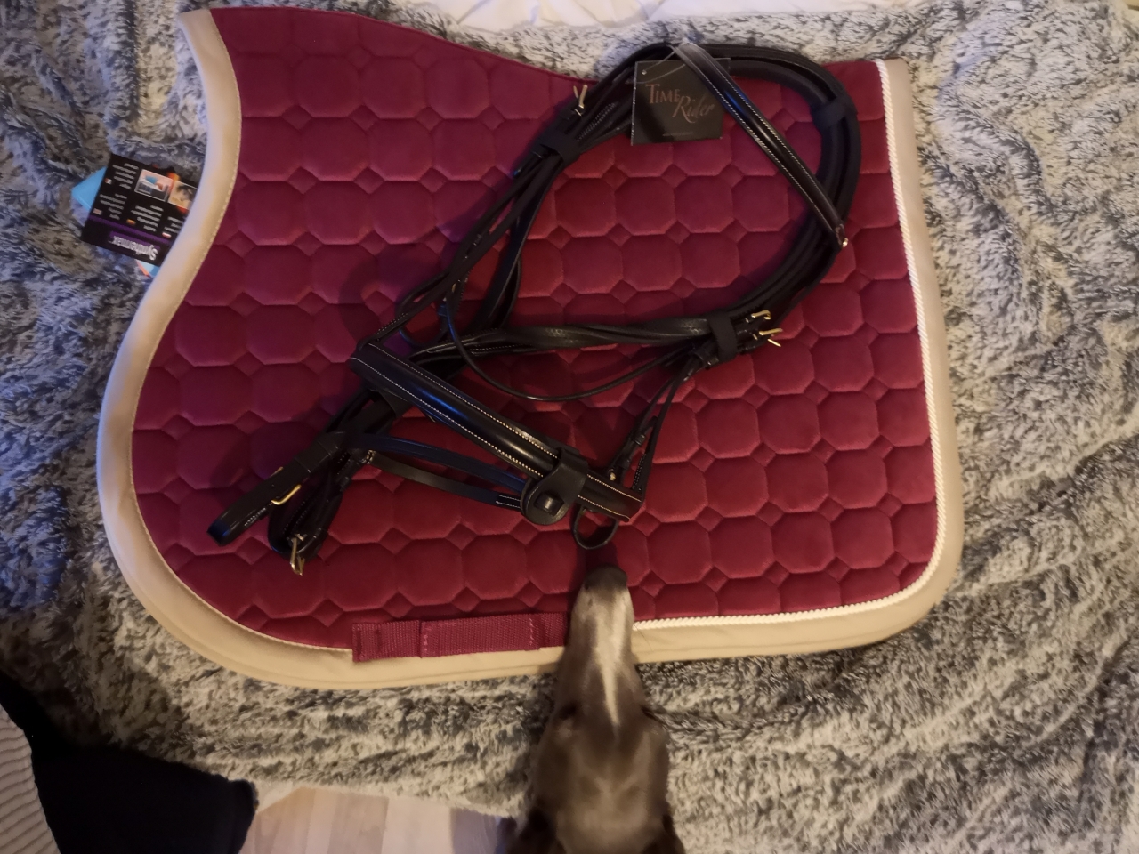| Dire merci | Joyeux Noël (en retard) à tous J'ai fais quelques achats en attendant le poilu. ![]() ![]() Ce n'est pas le tapis bleu ni le tapis vert que je voulais mais bordeaux et il est tout doux ( la mode de la suédine) Les couleurs que je veux je sais où ils sont... Chez Lemieux. mais sur AmaZonzon, je comprend rien à leur taille ![]() Je sens que la muserolle va être trop grande et que je vais devoir faire des trous dans le bridon. (le noseband vire et sinon il sera sans muserolle pour l'extérieur) Mon whippet vous fait coucou, il pensait que ça allait être son nouveau panier |