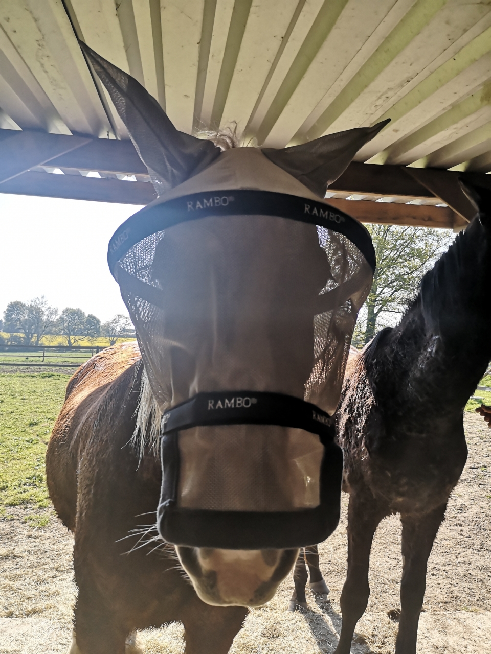 | Dire merci | J'ai du emmener les sacs de bouffe de Sam à l'ecurie. J'ai pu lui faire un bisou Et essayer le masque : Ça lui va très bien. Par contre il crève de chaud. Limite une tonte ça lui ferait pas de mal |
