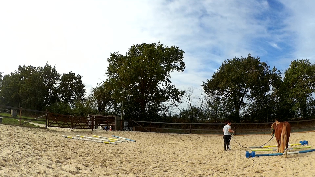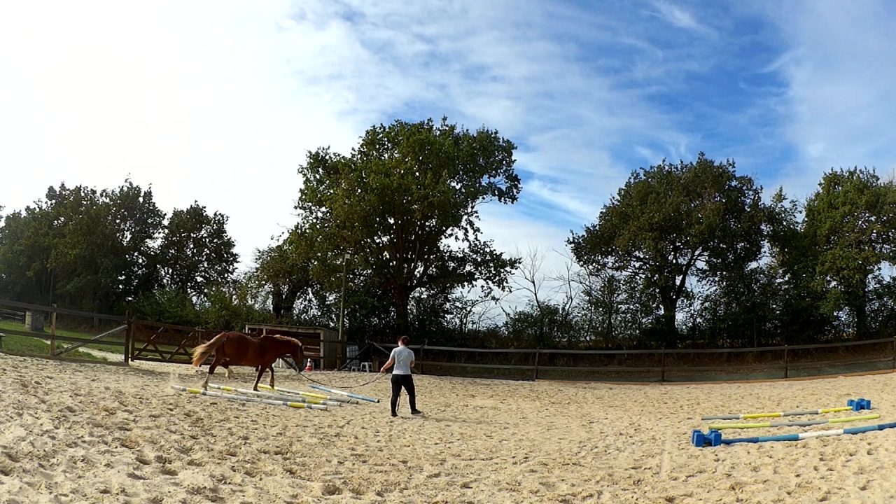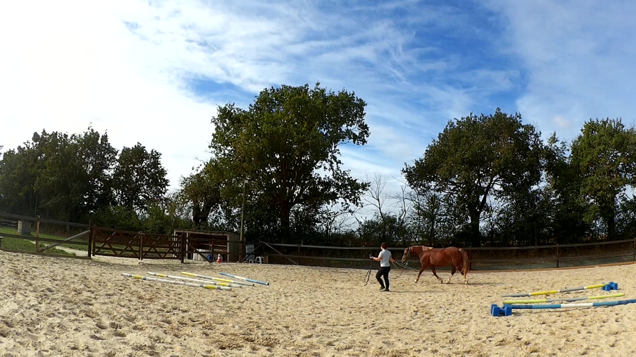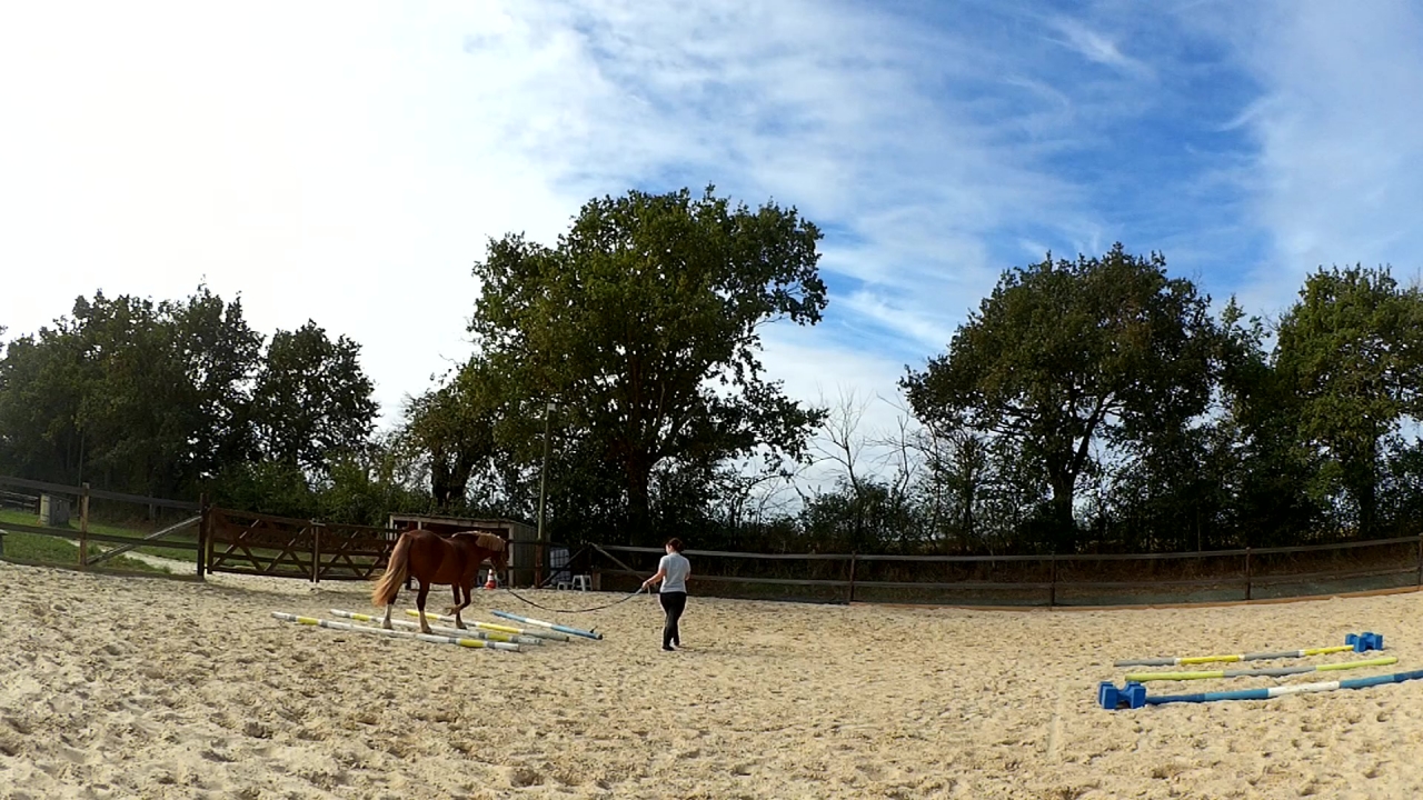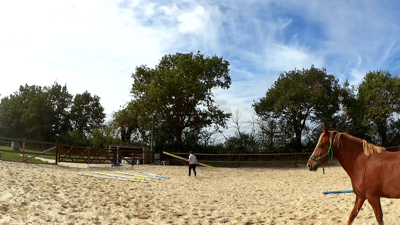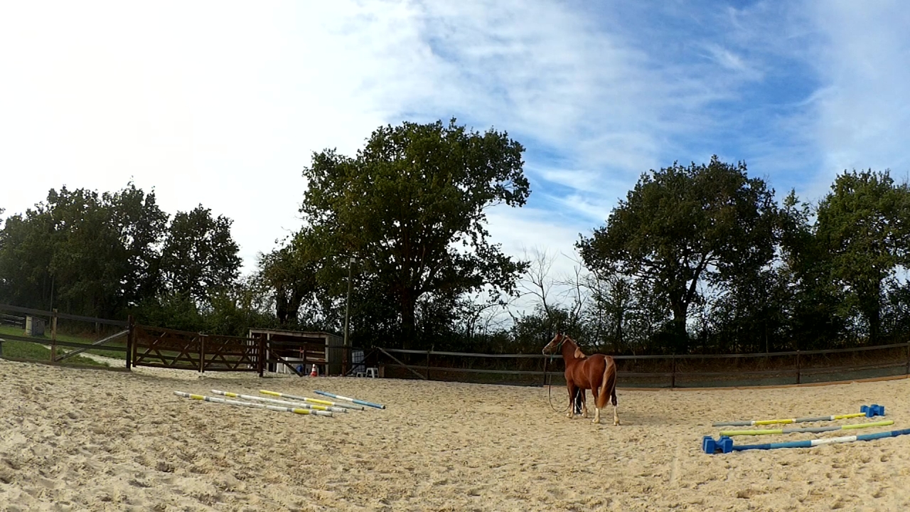 | Dire merci | Ah et hier, je l'ai monté en carrière. Deux barres au sol et deux portes avec des cônes sur un cercle. Travail au pas, au trot et tentative au galop. Mais là, c'était compliqué pour lui. Donc quand j'ai eu un tour "propre" j'ai juste fais une barre isolée à chaque main et je l'ai laissé là dessus. Sinon, il était très bien, au début un peu neuneu puis quand le neurone s'est connecté; c'était bon! ![]() |