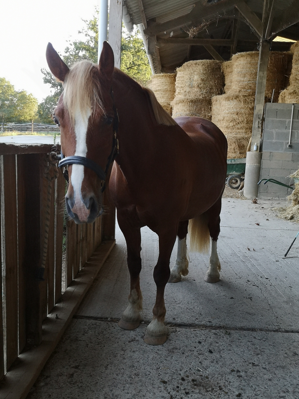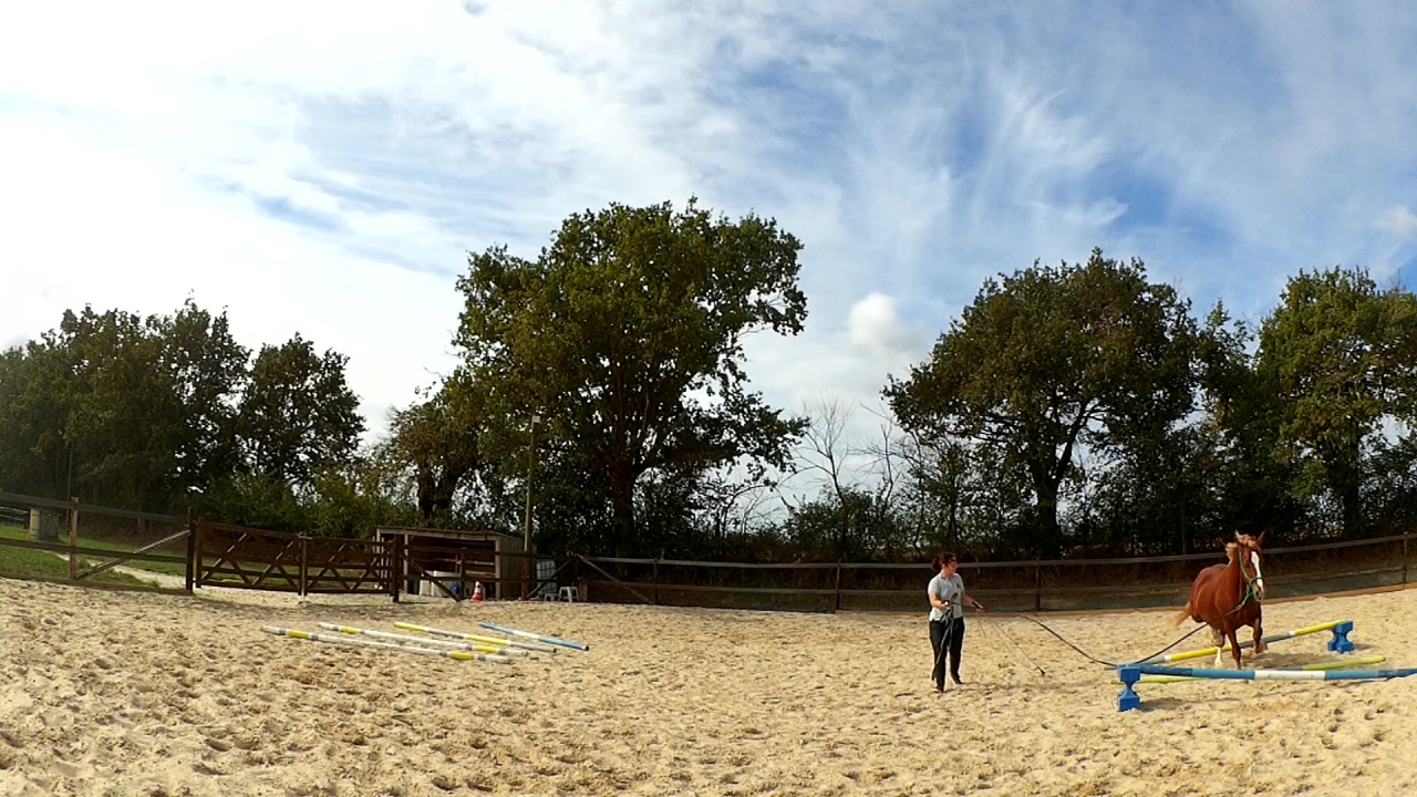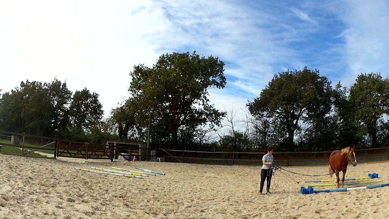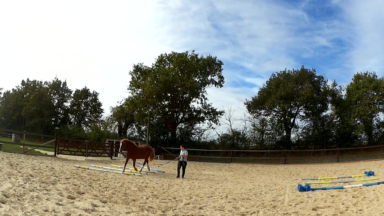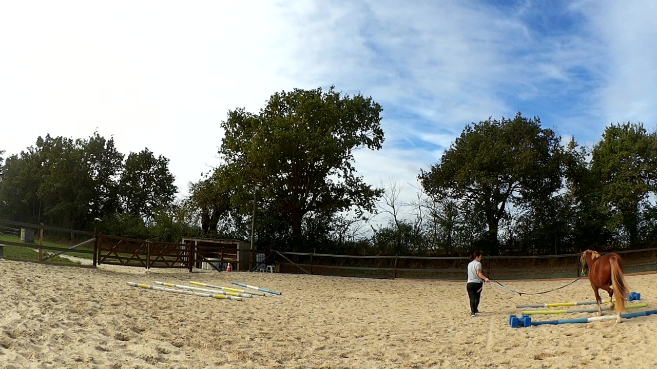 | Dire merci | Ah et hier, je l'ai monté en carrière. Deux barres au sol et deux portes avec des cônes sur un cercle. Travail au pas, au trot et tentative au galop. Mais là, c'était compliqué pour lui. Donc quand j'ai eu un tour "propre" j'ai juste fais une barre isolée à chaque main et je l'ai laissé là dessus. Sinon, il était très bien, au début un peu neuneu puis quand le neurone s'est connecté; c'était bon! ![]() |