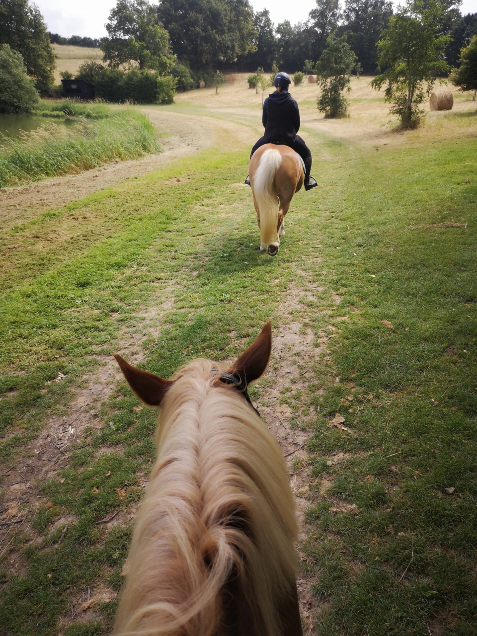 | Dire merci | On sort pas mal en ce moment pour préparer le rallye du 4 juillet. Il a eut quelques séances de longe entre temps, donc des sauts de puce au galop. Ou il a été très mignon. Après il a fait très chaud, donc difficile de le travailler tous les jours. C'est vraiment pas agréable et pas facile, donc je préfère qu'il ne fasse rien avec ces températures là. Après deux petits sorties pour remettre en route le poney de la gérante, on est allé aux étangs ce matin. Sam était en mode poney couillon au début, il m'a fait un semblant d'embarquement au trot en me prenant la main pour prendre le galop et doubler le copain poney.... Il a pas recommencé après ça ![]() Puis il était toujours à vouloir emmerder l'autre, on aurait dit un poulain. Mais dans l'ensemble il a été super mignon. On a galopé un peu dans un chemin d'herbe et pour prendre une grosse montée. Un peu de trot mais beaucoup de pas. Et j'étais contente, car il a transpiré mais pas trop, il commencerait à avoir de l'endurance ! La semaine prochaine, on prend le van pour aller direct aux étangs et prendre le temps de plus faire le tour. Puis ça fera un voyage aux poneys ! Et du coup le poney blond de la gérante, c'est celui que je travaille de temps en temps en carrière. ![]() ![]() ![]() |