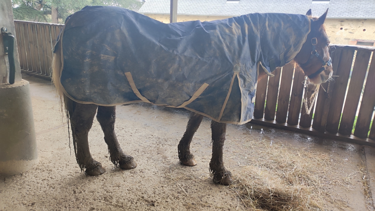 | Dire merci | Ce temps est dépitant j'en peux plus et poney aussi. Je l'ai remis au champs aujourd'hui vu qu'on a fini l'enrubanné. Mais bon au final, il était tellement colère dans son paddock, que l'apport n'a pas du être très grandiose... Je lui avais mis sa horseware hier vu que la pluie est froide .. elle a prit l'eau. fort heureusement, il était mouillé en dessous mais pas trempé. J'ai pu le sécher un peu et lui mettre une autre couv. J'ai pas trop eu le choix, n'en ayant pas 10000... En espérant que celle la tienne.... sinon ça sera une kramer qui m'envoie pas du rêve que j'ai en stock..Poney de boue ![]() ![]() J'ai du lui redonner un peu de foin pour le moral. Mais il est prit du nez... Je croise les doigts pour qu'il n'y ait pas plus de soucis avec cette humidité .... Autour de moi y'a plein d'emphysemateux qui sortent pas de crise a cause du temps pourri.... |