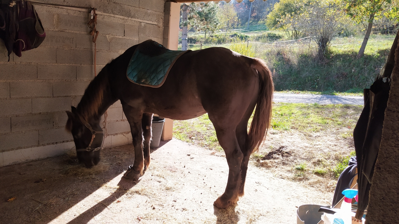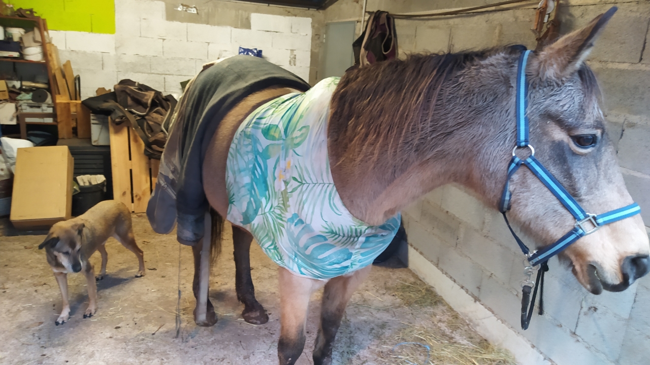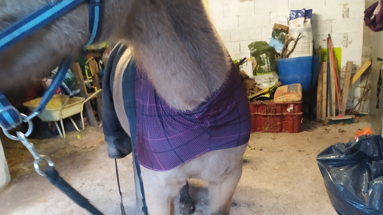 | Dire merci | @ouassou j'ai loupé le coche quelque chose de bien ! J'ai découvert S Dimanche midi car le temps était sec il a commencé à flotter en continu Dimanche APM ac température glaciale et ça ne s'est arrêté qu'hier en fin d'apm !!! Impossible de recouvrir et de les sécher ! Même en les laissant enfermé au box 5 h pour manger... Du coup hier soir j'ai enfin réussi à les sécher...et c'est qui à 22h qui était entrain d'etriller ses chevaux enfin secs pour pouvoir les couvrir ???? ![]() Bref S est recouvert et du coup j'ai collé la couv à O aussi...il était pas content l'animal ! ( Bon en mm temps il a été mal sellé et blessé partout au garrot pdt 7 ans alors dès que je lui colle un truc sur le dos c'est pas franchement le plus heureux !l) Pour la couverture j'ai enfin trouvé une qui lui va c'est une decath taille mamouth ! ![]() Bon elle est pas mal car elle couvre bien le garrot et monte bien plus haut...c'est pas une highneck non plus mais j'avais essayé sur plusieurs marques et c'était pas probant (trop sérré à l'encolure et le garrot frottait qd mm). Mais hier en parcourant un vieux post de erzebeth j'ai vu l'idée de couvre des boudins sous la couv pour préserver le garrot...alors j'hésite je vais surement faire ça mais je sais pas si je lui coud sur la couv ou sur le protège épaule... |