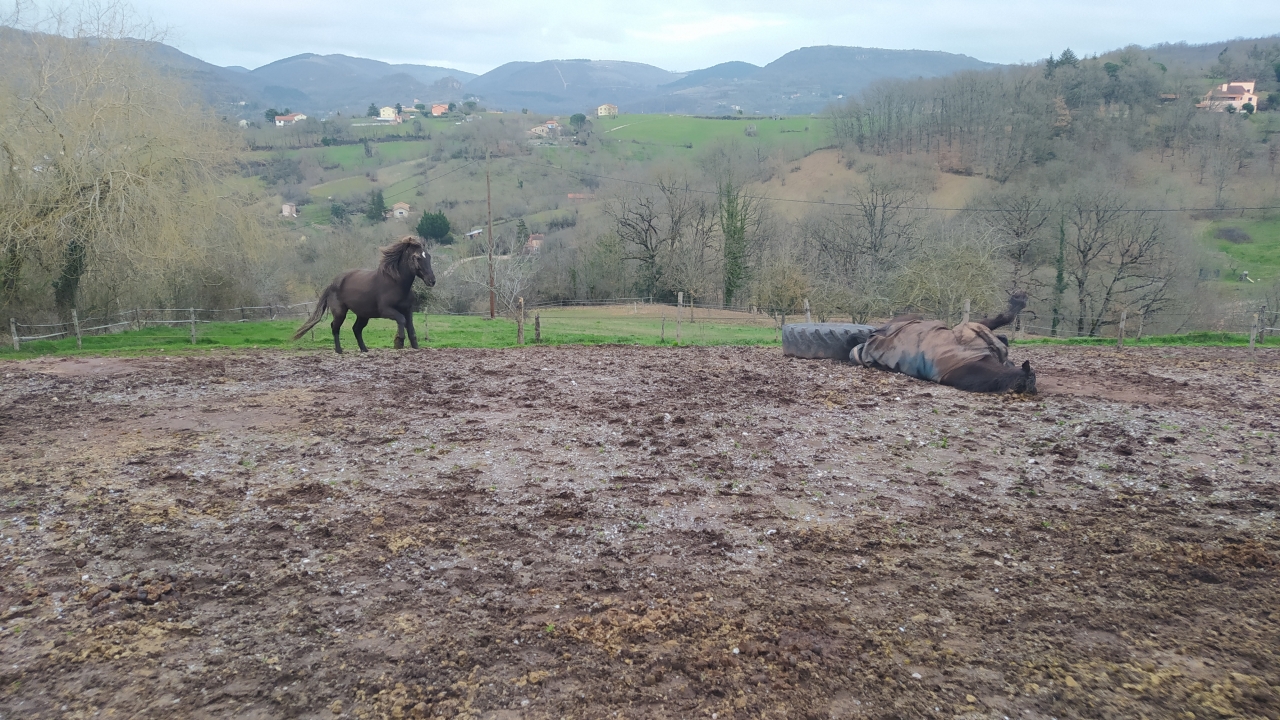 | Dire merci | Auj' ferrage d'anterieurs pour S et parage pour tous les autres pieds de la bande... J'étais entrain de ranger ma selle et de parler de mes projets de balade la semaine pro qd j'ai été cherché O...je l'ai attaché et il a instantanément mis son postérieur droit en pince... Mouaiiiis... Il était relou au parage du postérieur gauche... Mouaaaaaaaiiiiis... Je dis au pareur " y a un hic..." Il me dit que " maiiiiis Nooooon tu psychotes" il est juste au repos... Ouais qd il est pas au repos il le pose vachement en avant... Je le fais trotter après le parage...bon ba forcément fraîchement paré sur les graviers le pareur se marre car il est "boiteux des 4" comme il dit... Bon...ds le doute il a eu ce soir cataplasme d'argile / arnican et Traumasedyl ds la ration... Je ferai le point demain, j'avais prévu d'aller le marcher en main... ( A force de faire le zouave plein cul ds le paddock glissant avec S : photo d'hier apm...) ![]() |