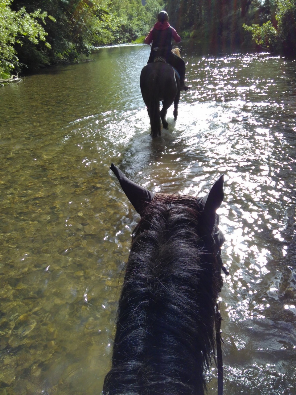 | Dire merci | Pour les tiques je check ts les soirs dans les endroits stratégiques. Mais là je vois que les mouches plates arrivent du coup je vais traiter au Butox et ça fera une pierre 2 coups... Hier j'ai répondu à l'envie de baignade des chevaux et je suis partie à la fraîche avec O direction la rivière. Aller à pieds, retour à cheval... c'était pas du luxe vu le bidon d'herbe qu'il se paie. C'était une balade digestive du coup. Heureusement que l'accès au pré est limité qd mm ! Sinon je suis contente car je suis partie pieds nus et il était bien carré ! Je me dis que les gluco/chondro/msm et boswellia qu'il prend maintenant depuis + de 2 mois commencent peut être à faire leur effet de soutien ! Il avait bcp d'entrain, l'accusait pas, bref ça fait plaisir ! ![]() |
