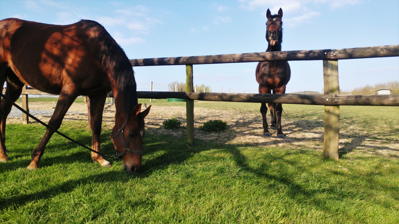 | Dire merci | Mission first date : check ! Ils ont été sages tous les 2. J'ai présenté V à la barrière du pré de N, ils se sont intéressés l'un à l'autre et se sont sentis. Après V n'en avait plus rien à foutre alors que N est resté scotché à la barrière (d'ailleurs ils sont 3 hongres dans son pré, c'est bien lui que ça intéressait le plus !). A la fin, V est revenue voir N .... et lui a pissé de chaleur sous le nez ![]() Comme d'hab, N incapable de faire une séance photo sans faire l'andouille... ![]() ![]() Et V la chaudasse... ![]() |