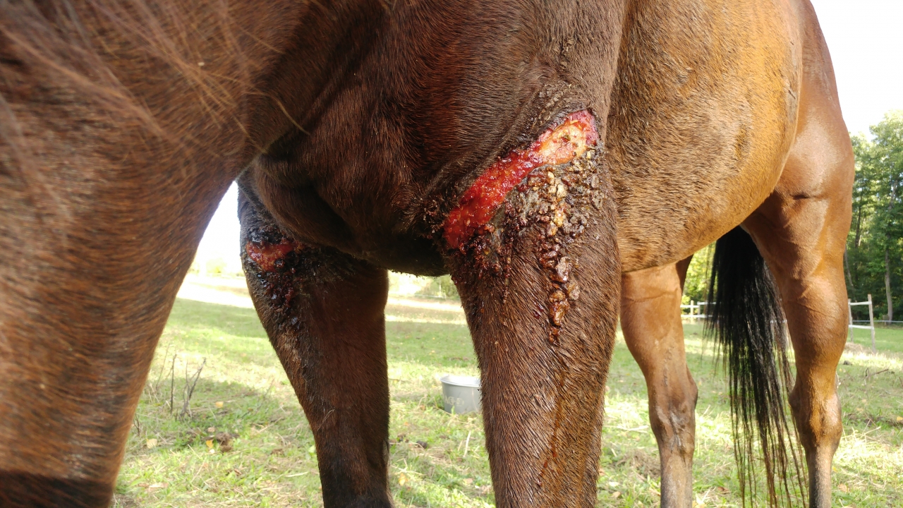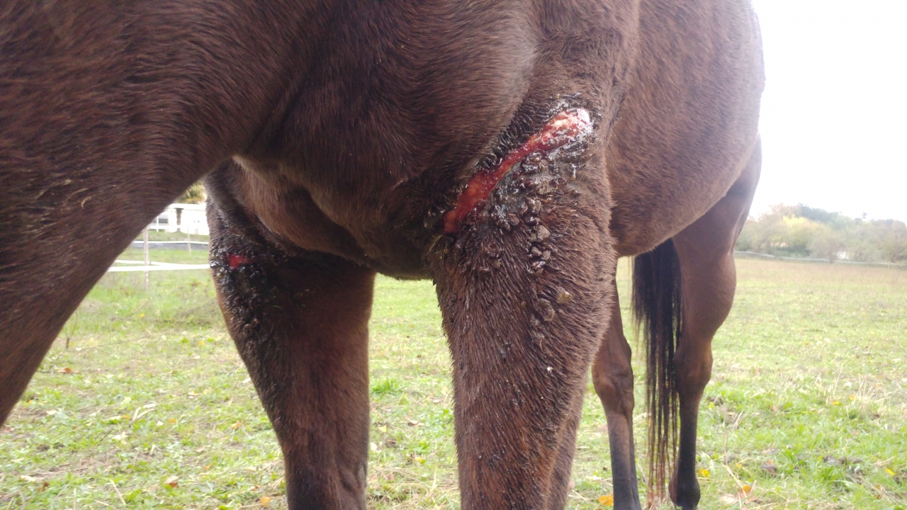 | Dire merci | Ça ressemble tout à fait à ce que j'ai eu sur une jument empalée (qui par ailleurs s'est remise sans séquelles) |