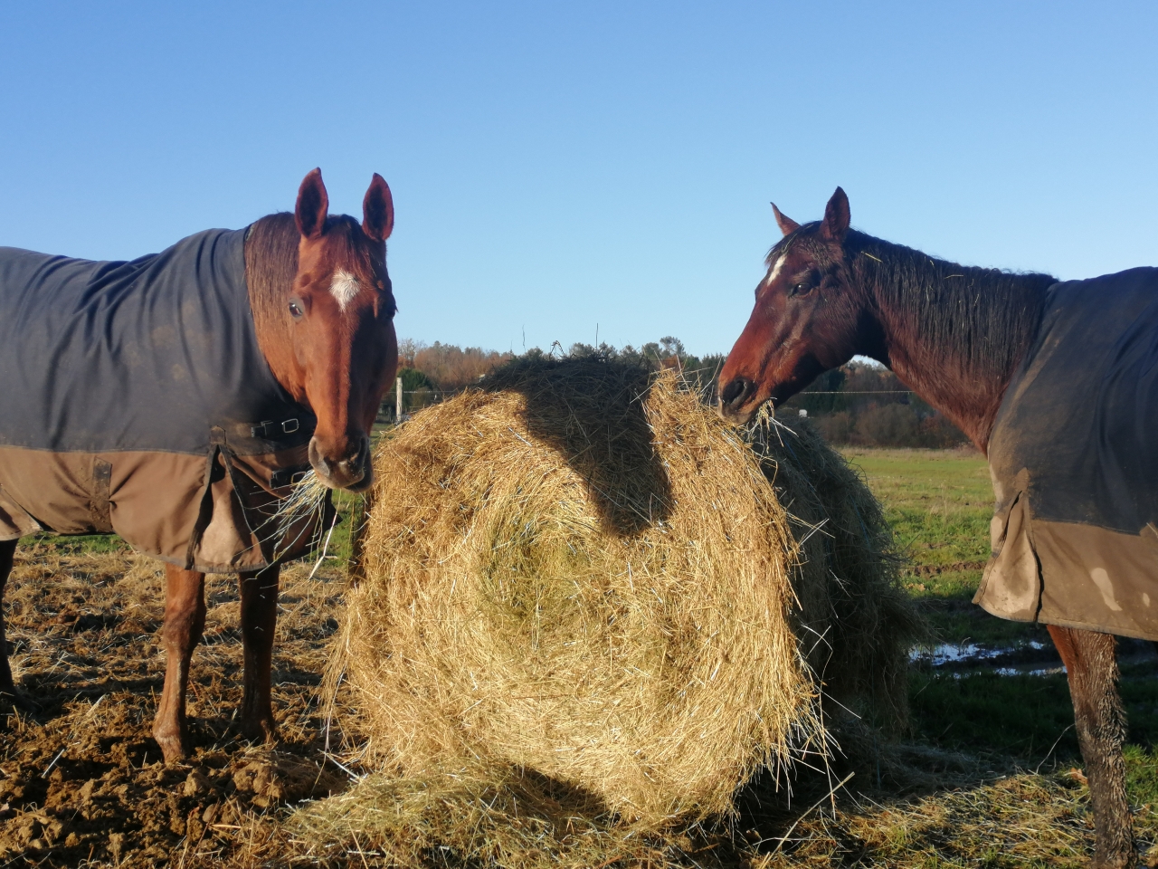 | Dire merci | La sortie du pré d'été approche. Comme l'année dernière, ce sera environ mi-novembre. Et pour les mêmes raisons : ça devient humide et les chasseurs me cassent les c*... Je sens les chevaux inquiets qui hésitent à utiliser l'abri. Et en plus, je trouve l'herbe moins nutritive que l'année passée, pour V c'est pas plus mal mais N a besoin de plus. Il lui faut du foin. Et donc, après avoir passé l'été à chercher, ils vont aller juste à côté d'où ils sont actuellement. Je ne voulais plus les remettre là où ils étaient l'hiver dernier pour plein de raisons. Ça va me coûter un peu plus cher, c'est un peu plus loin de chez moi, mais c'est mieux pour eux. Ils y seront probablement le week-end prochain ou celui d'après. Pour l'hiver j'aurais vraiment aimé les avoir plus près, mais je ne trouve rien ... |