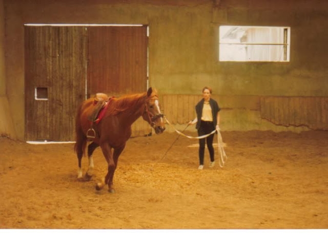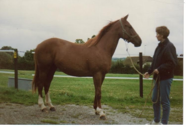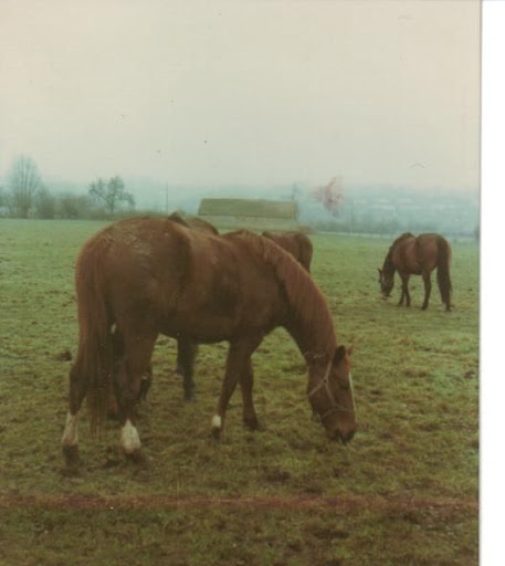 | Dire merci | J’appelais donc une charmante jeune femme prés du haras du pin , qui me demanda comment était mon cheval. Je lui racontais que je n’en avais pas encore et là-dessus , bonne commerçante , elle me proposa de m’aider à chercher la jument de mes rêves. Top là , elle me prend rendez vous avec cinq éleveurs de sa région pour le dimanche suivant. Premier éleveur , Haras de Brullemail , excusez du peu….. Bernard Lecourtois en personne me sort une pouliche de deux ans alezane , petite (1,50m) , très bien manipulée par Brilloso et Valdanne (cette dernière étant sa jument de concours qui avait tourné sur 1,40m). Il m’explique qu’il me la vend car aucun professionnel n’en voudra car elle est trop petite (j’adore les petits chevaux) , qu’il ne l’a jamais testé sur les barres (tant mieux) . Les visites suivantes sont toutes d’un autre acabit …. De magnifiques pouliches ….sauvages. Pas moyen de les approcher , je ne me voyais pas à la tête de ces furibondes. Et puis USCITA MAIL m’avait tapé dans l’œil. 15 jours après , nous revenions chez Lecourtois , chercher Uscita pour l’emmener vers sa nouvelle demeure. J’étais un peu inquiète , me demandant si elle allait accepter de monter dans la bétaillère. Monsieur Lecourtois m’a assuré qu’il n’y aurait aucun problème et elle est montée derrière lui sans broncher. Toute sa vie , Uscita montera dans les vans comme une pro , il suffisait de la mettre devant et elle montait toute seule , il n’y avait plus qu’à mettre la barre derrière. J’ai eu beaucoup de chance , je suis tombée chez L’ELEVEUR , qui faisait un travail avec les poulains , de sorte qu’ils soient pratiques dès leur plus jeune age. C’était très rare à l’époque. Voici Uscita le jour de l’achat (avec moi , jeune puisqu'Uscita est née en 1986) : ![]() |