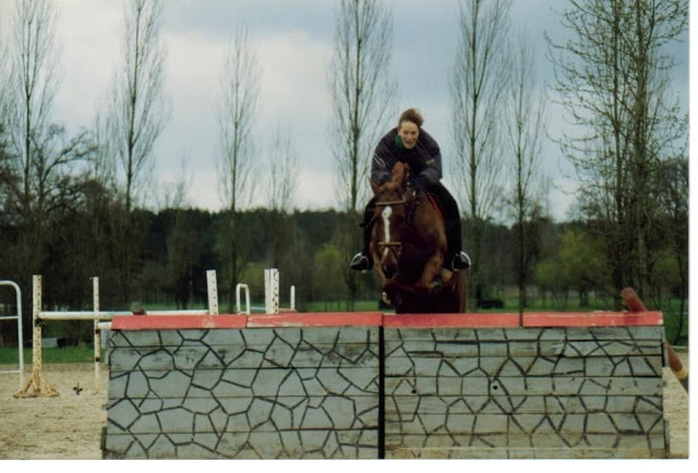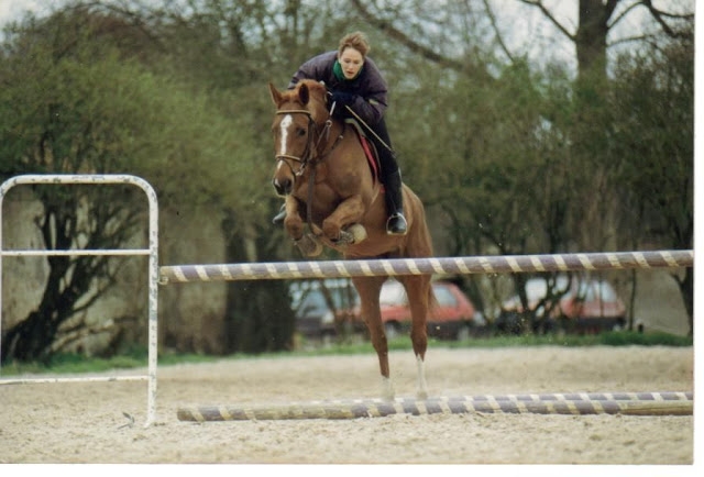 | Dire merci | Après la finale de fontainebleau début septembre 91 , je mis Uscita dans une formule pré pendant deux mois mais dans la foret de Rambouillet ce qui me permettait de la monter le week end , et je traversais la foret pour aller prendre mes premiers cours d'obstacles. Sans aucune honte , mes entrainements d'obstacle ont commencés sur 50 cm car si Uscita avaient les moyens de faire bien mieux , il fallait qu'elle s'adapte à sa cavalière amateur. Car un cheval monté par un pro , a l'habitude d'arriver dans la bonne foulée . Ce que j'étais incapable de faire Donc , il a fallut qu'Uscita apprenne à corriger mes erreurs , et qu'elle gère les "longues" et les "courtes". D'après la base de données , que nous tenions , j'ai fait mon premier concours d'entrainement en decembre 91. Sur 1m , sans faute. Le bonheur intégral ..... Uscita était d'un certain coté , facile puisqu'elle fonçait sur les barres quand elle les voyait, sauf quand c'était un mur ou un bidet. Mais elle était aussi assez timide en concours sur le premier tour. Nous avons compris cela avec Papa-ASSI quand nous faisions des entrainements avec elle. Papa-ASSI (qui avait beaucoup progressé) , la montait en premier et essuyait quelquefois un refus et moi je la montais ensuite et j'étais régulièrement classée . Cela s'avèrera vrai toute sa vie de compétitrice , il fallait lui faire faire une petite épreuve pour qu'elle voit le terrain et les obstacles afin qu'elle soit performante sur la "grosse". Je vais vous mettre quelques photos d'elle et moi à l'entrainement (des belles , évidemment) : |