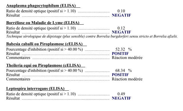 | Dire merci | Donc voila les resultats , le traitement commence lundi prochain :![]() Anaplasma phagocytophilum (ELISA) Ratio de densité optique (positif si > 1.10) ............................... 0.10 Résultat ..................................................................................... NEGATIF Borréliose ou Maladie de Lyme (ELISA) Ratio de densité optique (positif si > 1.10) ............................... 0.12 Résultat ..................................................................................... NEGATIF Technique sérologique de dépistage (plus sensible) contre Borrelia burgdorferi sensu stricto et Borrelia afzelii. Babesia caballi ou Piroplasmose (cELISA) Pourcentage d'inhibition (positif si > 40.00 %) ........................ 52.32 % Résultat ..................................................................................... POSITIF Commentaires ........................................................................... Réaction modérée Theileria equi ou Piroplasmose (cELISA) Pourcentage d'inhibition (positif si > 40.00 %) ........................ 68.34 % Résultat ..................................................................................... POSITIF Commentaires ........................................................................ Réaction modérée Leptospira interrogans (ELISA) Ratio de densité optique (positif si > 1.10) ............................... 0.49 Résultat ..................................................................................... NEGATIF Message édité le 03/08/21 à 19:51 Message édité le 04/08/21 à 12:51 Message édité le 04/08/21 à 12:51 |