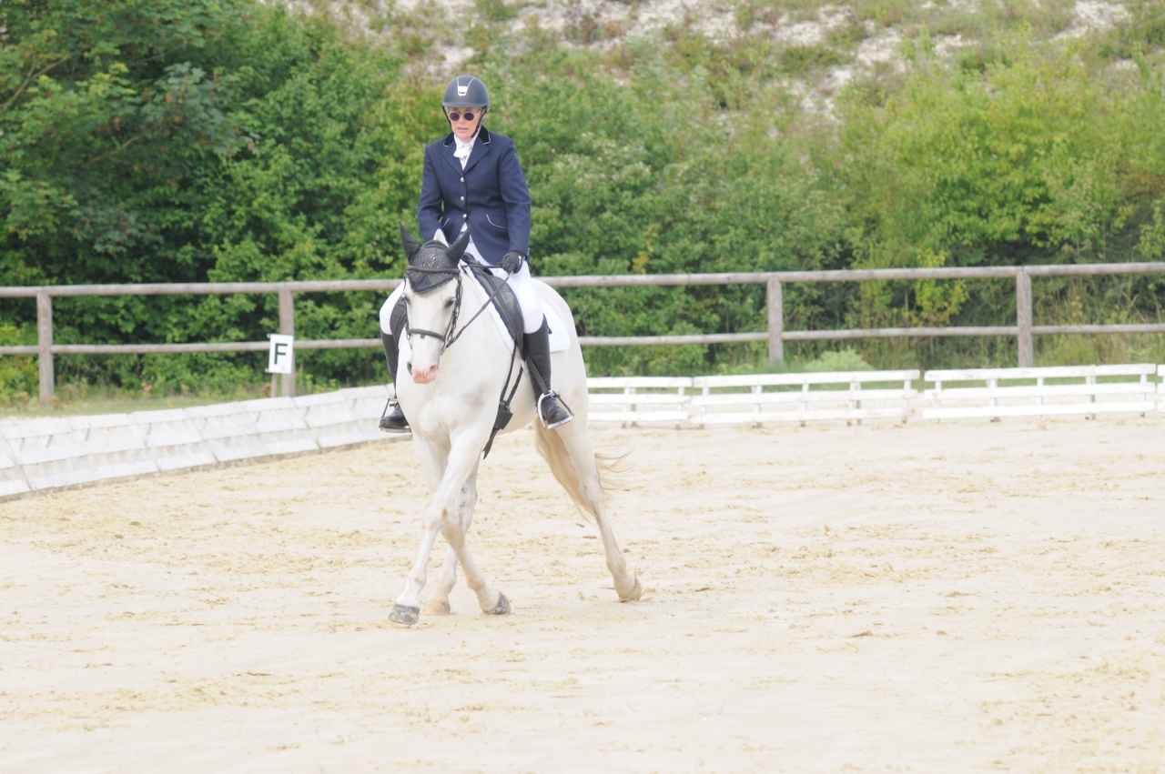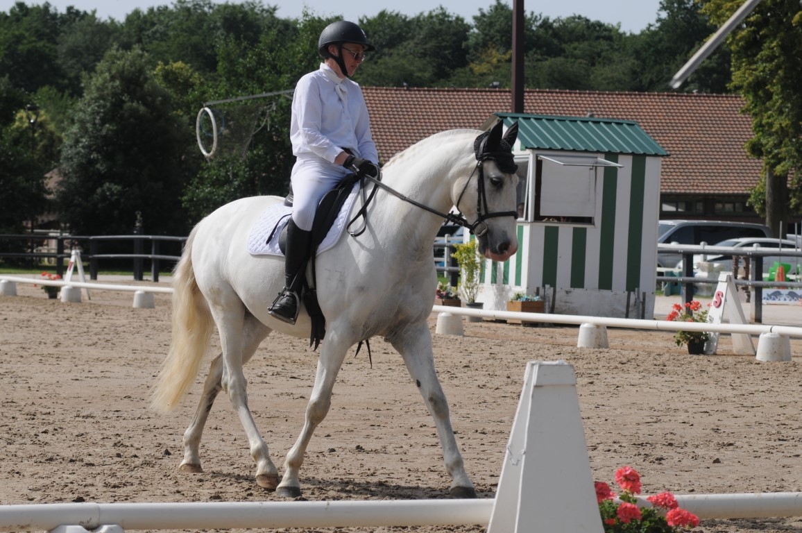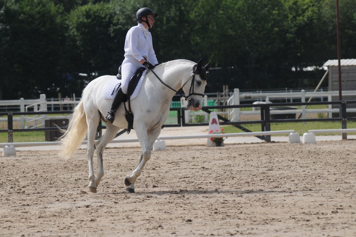 | Dire merci | Comme je n'etais pas tres contente du championnat , j'ai engagé pour une amateur 3 preliminaire et une amateur A a ce week end. Quand j'ai vu les engagements (numero 1 de l'amateur 3A et derniere de l'amateur 3 premlimaire) J'ai appelé le responsable du concours et je lui ai demandé de mettre la preliminaire avant la 3A , de cette façon j'enchainais les 2 reprises sans pause. (Parce que ca me gonflait d'attendre une heure et de faire 2 détentes Falcao n'etait pas en forme du tout ce matin , départ à 7h15. Cette nuit , il y a eu un feu d'artifice pres de la maison , et je me demande si les chevaux ont fait les cons. Bref , ma premiere reprise etait à 9h21 , je commence à detendre et j'avais un cheval mou , et un peu dur dans la main , ce qui est tres rare chez lui. J'ai enchainé les epaules en dedans pour essayer de decontracter. Entre le cheval chaud du championnat et le mou de ce matin ![]() ![]() Pas trop de temps pour detendre , il etait vraiment lourd. 1ere fois que je faisais la preliminaire cette année , je ne suis pas au top pour les transitions galop pas , surtout avec un cheval qui plonge. Quelques photos ![]() Serpentine au galop ![]() Bref , pas terrible , j'aurais 65,50. Je sors au pas renes longues et je vais au pas re-saluer le jury. J'ai vu que la juge en C etait tres etonnée que j'enchaine 2 reprises. Mon petit cheval commençait a etre détendu , et je l'ai senti mieux pour attaquer la 2eme reprise . ![]() cercle de 12 m ![]() trot allongé ![]() Croise papattes ![]() Je sors 1ere (sur 4) de l'epreuve avec 67,9%. C'est cool , maintenant , je vais le laisser tranquille tout l'été. J'ai un super petit cheval , il sait faire plein de choses mais comme je ne prends pas de cours , mamie ne progresse pas. Il faudrait vraiment que je me bouge |