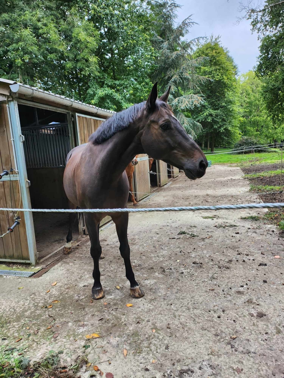 | Dire merci | Quelques changements dans nos aventures. On n'y pensait pas mais quelq'un nous a demandé si Gold etait à vendre pour faire poulinière . Elle a des papiers tres interessants (STAKKATO ) Et on s'est dit pourquoi pas mais avec un contrat qui fait que si ils veulent la vendre nous avons la priorité et que ce ne soit pas pour la monter. Bref , Gold part le week end prochain à 15 kms. Et mon mari me dit , si Gold part , j'aimerai bien avoir un cheval safe mais qualiteux , car monter Iness quand on a 72 ans relève du défi permanent. c'est quand meme une jument qui colle des écarts à chaque séances à cause d'un papillon ou d'une feuille morte.. Donc je mets une annonce , ou je cherche un cheval de 13/15 ans avec des résultats en concours , tres gentil et moins de 10 000 euros., ce serait pour faire un peu de hunter. Et quelqu'un me dit j'ai ce cheval . Il s'appelle Vidocq , c'est un diamant de semilly , il a fait 130 , et quelques 140 mais pas classé. Il est super gentil , il ne regarde rien. Mon mari l'essaye , le cheval est super cadencé et plutot beau , membres impeccables. J'ai retrouvé une video de lui à 3 ans , aux ventes NASH : Lien Il est arrivé ce matin. ![]() Avec Quelus (qui est son oncle) ![]() |