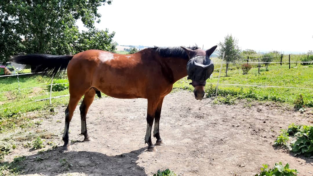 | Dire merci | takhan la derniere fois qu'il vrillait comme ca l'ostéo découvrait un blocage au niveau de la nuque niveau dentiste c'est prevu courant juillet/aout et ensuite l'ostéo (je fais toujours venir le dentiste avant l'ostéo) mais si c'est comme l'année derniere (quand il vrillait) pas de surdent juste un nivellement à faire, donc je pense à un blocage de nuque. en plus l'ostéo m'avait conseillé de le monter en howlet en reglage leger , juste de quoi lui orienter la nuque. et là ca fait quelques seances que je lui enleve et il se met à vriller au bout de la deuxieme seance sans. nélimihas1bis je ne me suis jamais baignée entierement avec un cheval et en plus là dans l'etang beurk quoi encore dans un lac ou à la mer pourquoi pas mais là c'est franchement dégeu avec ce que calin a deposé dedans |
