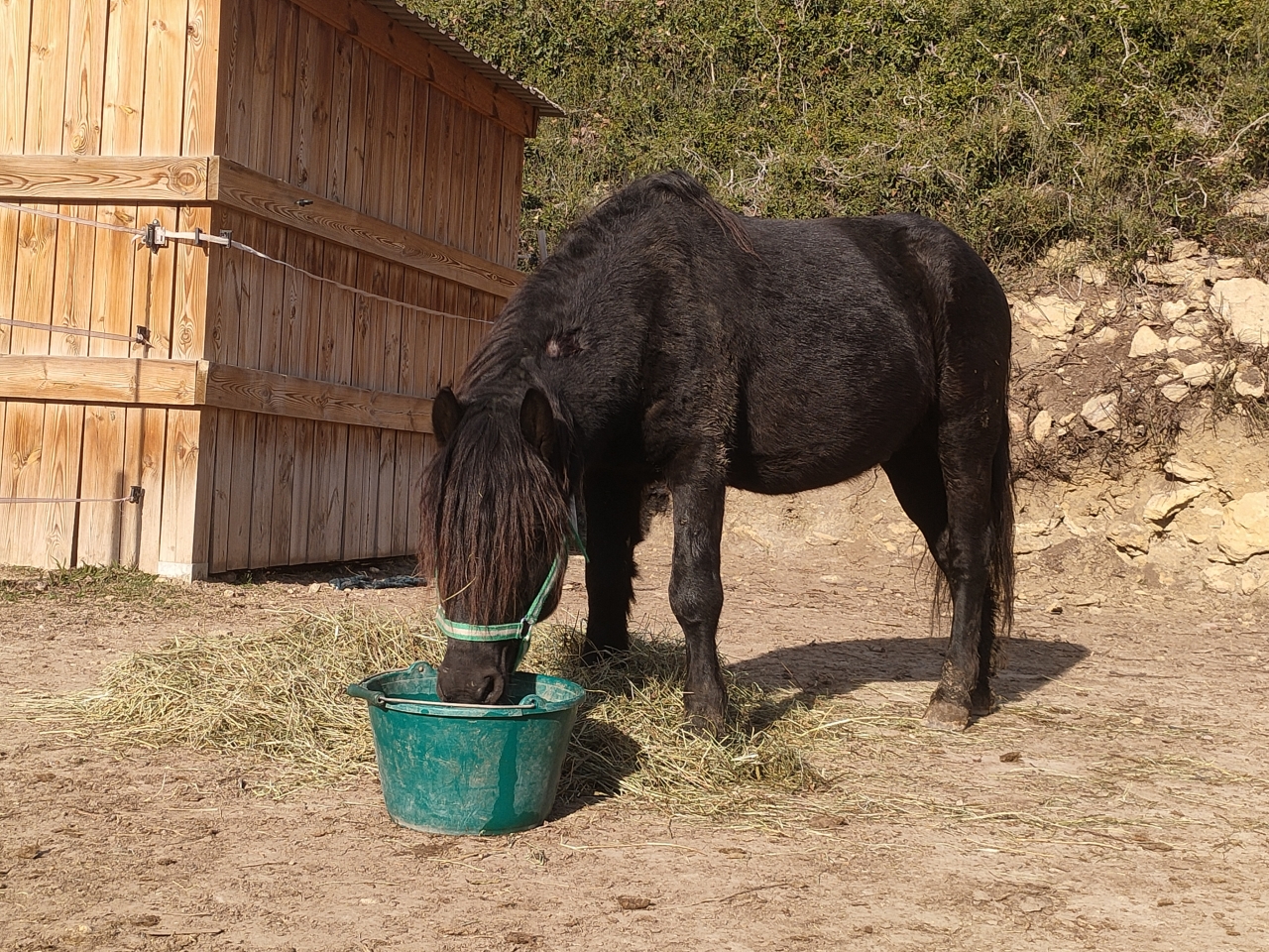 | Dire merci | J'aime bien aussi, en mode pas couffle de gras et luisant de chaud. Il me fait un peu penser à un pottok, la taille poney mais l'allure et surtout la trombine plutôt cheval. Je dis ça parce que j'en héberge un (-retraite club destiné à mes enfants... Qui s'en tapent royal! M'en fous, il est le poney dont je rêvais enfant et que je n'ai jamais eu 🙂 , je retrouve un peu la même expression de cheval en taille poney |