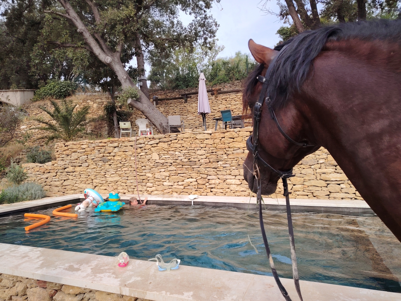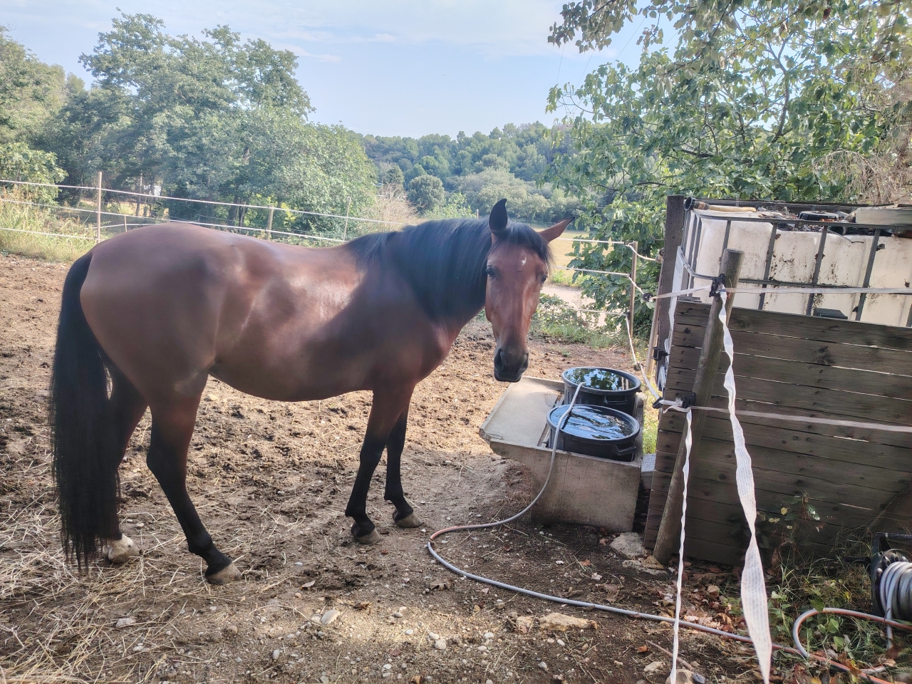 | Dire merci | Cocktail non pas vraiment. Là c'est un paddock mais la propriété est irriguée avec les canaux de Craponne donc normalement y a de l'herbe a l'année. Malheureusement il y a 4 ans le canal s'est effondré et nous sommes en procédure avec la mairie pour la réfection du canal. D'ailleurs le paddock que tu vois était en herbe haute il y a pas si longtemps. |