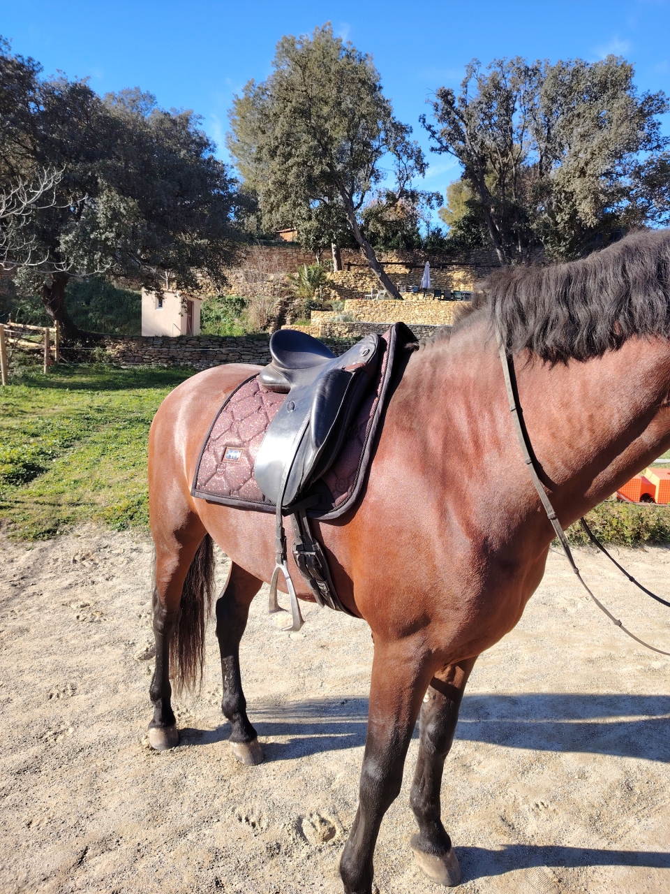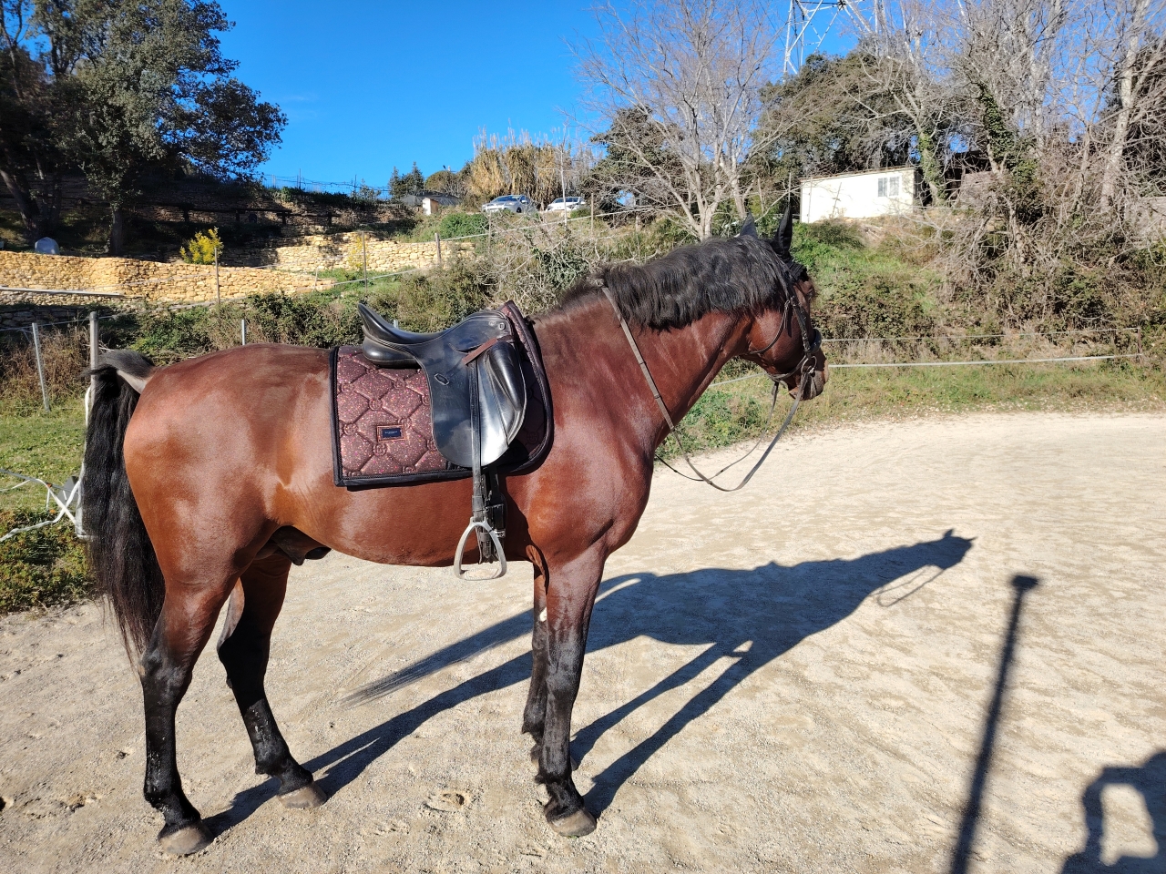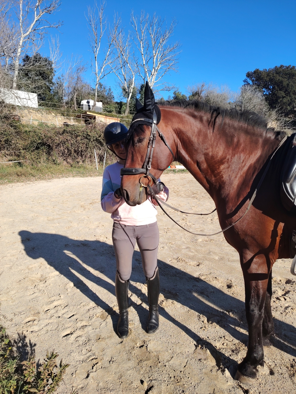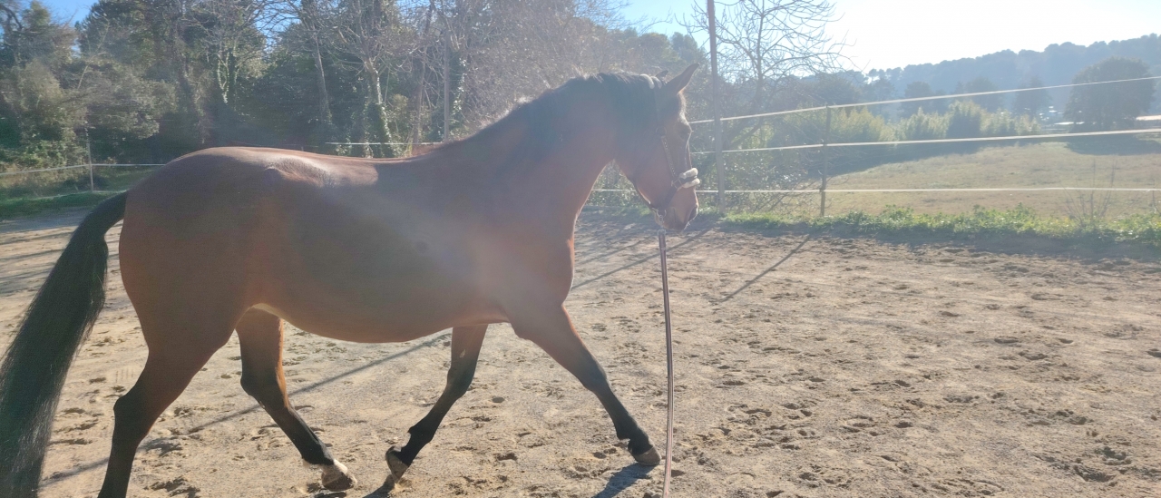 | Dire merci | Vandalo a enchaîné 3 jours de reprise et il me fait des top séances. On marche beaucoup ça caille et le sol est un peu dur sur un côté de la carrière ça crisse quand je passe dessus. Du coup on reste pas mal sur des cercles. Hubert nous fait travailler sur plein plein de micro transitions genre 3 foulées. On a empile la pierre tourner les épaules ET faire des variations d'allure. J'ai de sacrés sensations Je le monte vraiment qu'avec le dos pour les transitions et une micro fermeture de main si besoin du coup tout est plus clair pour lui. On avait vu qu'il avait du mal a soutenir sa nuque a gauche, ça vient de l'épaule qui fuit et notamment dans les appuyers c'est flagrant donc on fait l'enchaînement petit cercle au pas en tournant bien l'épaule, quelques pas d'eed a la piste et on part au galop comme ça. Tout bénef il est soutenu devant et plié derrière. Parfois il fouaille de la queue dans le départ surpris lui même que c est plus exigeant mais alors la qualité des foulées derrière un régal. On place souvent quelques tours de pas déplié et revenir en main pour vérifier que le dos ne s'est pas rigidifié. J'ai encore souvent quelques petites crispations quand il se remet en main savant mélange pour lui demander de continuer à marcher mais pas pousser pour pas l'emboutir devant. Ce matin j'ai passé 1 cdp a chaque main après ce travail au pas et départ au galop en gardant le même galop et évidemment ils sont passés très très bien. Un petit huit au galop pour le basculer sur mes aides extérieures en gardant le même équilibre et basta pour ce matin. 3 séances de 30 minutes absolument top. Repos pour 2 jours et voilà. Très contente de lui, a l'aube de ses 9 ans on avance a pas de géant sur l'équilibre et la correction des allures |