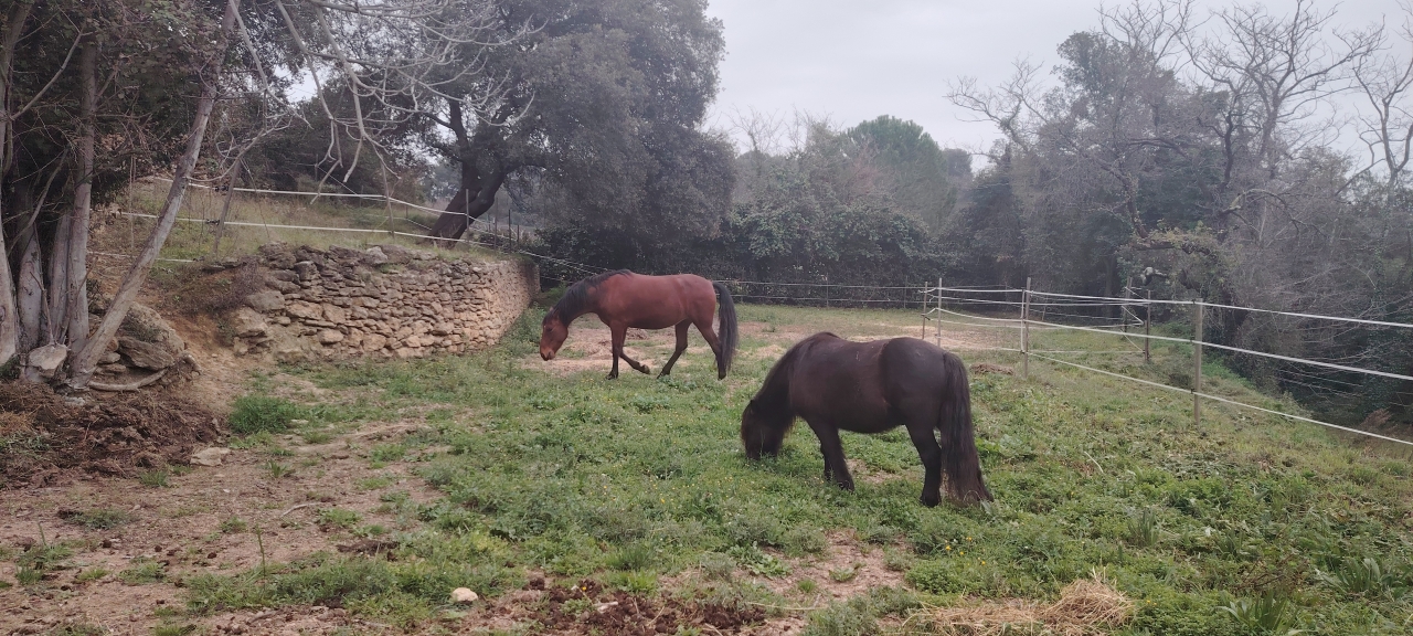 | Dire merci | Merci Ça a l'avantage de faire un petit no mans land entre les garçons et la jument. En bas a droite de la carrière y a le grand champ d'un hectare pour vandalo et takhan et en haut y a 7000 en restanques divisés en plusieurs paddocks. Autour de la carrière y a des petites zones d'herbe pour la récup après séance. |