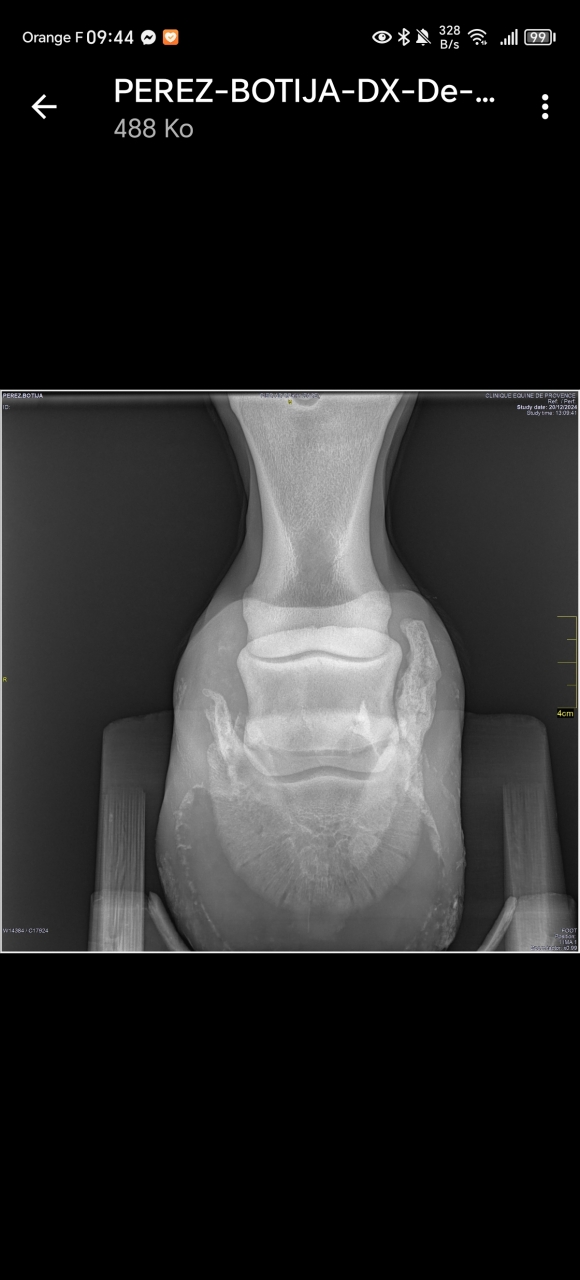 | Dire merci | Je vois le truc, en radio, de cette phalange qui fait comme un U avec des pointes de chaque côté, c'est ça ? Alors, je n'y ai jamais été confronté à ma connaissance, mais j'ai pu constater sur ms divers arthrosiques que le remaniement osseux pouvait engendrer des boiteries légères ou non quand il se produit, un petit peu ce qu'on va appeler des poussées d'arthrose, puis la loco redevient bien quand la poussée est finie. J'imagine que ça peut être la même chose pour Boti quand ça bouge dans le pied ? J'imagine qu'à continuer à un entretien physique au boulot, ça l'aide à un meilleur équilibre global vu la tendance naturelle des chevaux à peser nettement plus sur les antérieurs. De toute façon, c'est bien le genre de cas où on fait surtout ce qu'on peut au feeling |