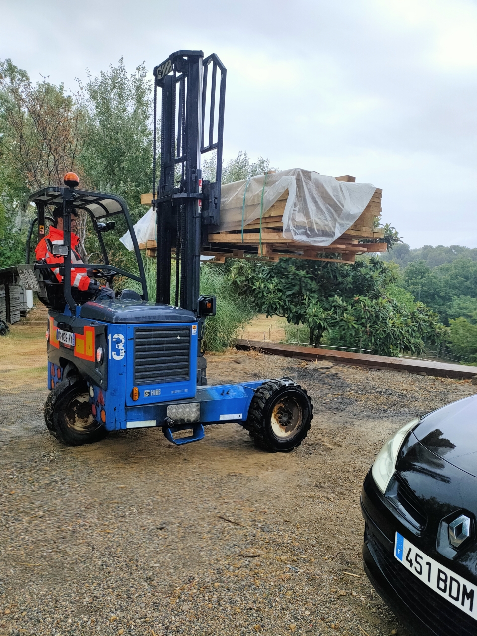 | Dire merci | et voilà show must go on! les trous de l'abris sont fait et ce matin sous une pluie battante l'abri a été livré. Quelque part je bénis la pluie parceque pour planter les piquets à la tarrière samedi ce sera plus simple La grosse blague quand j'ai vu arrivé le 40T dans mon petit chemin, hey monsieur j'avais demandé un porteur hein... Bah le chauffeur s'est pas démonté, il a tout refait en marche arrière, a planté son camion dans la route principale, balec et il a amené mon abris avec un engin du diable a 3 roues. Donc si on récapitule, j'ai les 2 tiers des clotures qui sont ok, les trous des fondations ok. Manque plus que tirer les fils et monter le bazar. L'eau est amenée aussi dans les paddocks du haut, bref on est bien. Moins cool je suis tellement à fond que je suis vidée pour espérer monter efficacement... La pioche aura eu raison de mon canal carpien main droite |
