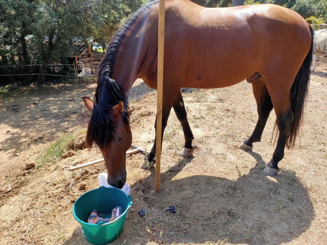 | Dire merci | merci et pour finir on a coupé le paddock de Takhan en deux, comme ça, cela éloigne un peu plus les garçons du pôle mère-enfant Inconvénient je perds en broutage une petite partie qu'ils aimaient bien et au passage ils me faisaient les bordures de la carrière. Tant pis ce sera Takhan qui aura ce privilège en plantant des piquets temporaires. Je me risquerai pas a mettre Vandalo cote/cote la pouliche avec des piquets tempo. Sinon je suis plutot contrariée car j'ai testé toutes les clotures et sur le parc de la pouliche c'est vraiment faiblard, donc faut que je trouve d'où ça vient... Trop de connections peut etre? Bref c'est pas finiiiiiii ! et moi je monte pas pendant ce temps là! Plutot bonne nouvelle aussi les bobos de Takhan (nombril et fourreau) se cicatrisent bien, il est mignon je lui fais les soins en talons aiguille ou en pyjama le matin en lib dans le paddock avant d'aller bosser... il bouge pas une oreille alors que l'alu spray et le rincage a l'eau sur le fourreau d'habitude c'est pas son truc. Meme Vandalo aime pas trop à l'intérieur des cuisses et là mes deux garçons se statufient c'est dans des moments comme ça que j'apprécie :1/qu'ils semblent comprendre qu'il y a un confort immédiat après (les mouches et taons ne se collent plus) 2/le "tu attends" est presque la commande que je trouve la plus utile, chiens/chevaux/enfants confondu |