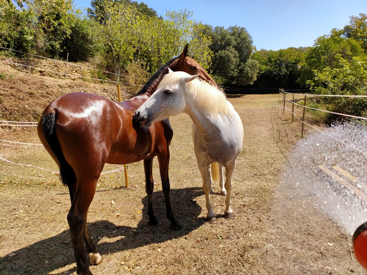 | Dire merci | Cette pouliche me surprend tous les jours. J'y vais pour remettre de l'eau, très intéressée mademoiselle bon ça s'est fini en douche intégrale en liberté ![]() Ce soir si je me sens d'attaque je la sors dehors en main avec une copine et son cheval assurance vie. M'enfin ça va a l'encontre de ma "méthode" un jour une nouveauté, nous verrons. |