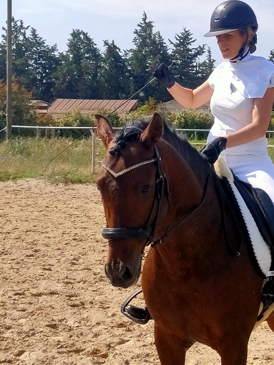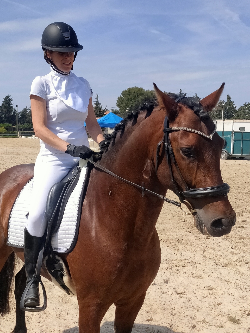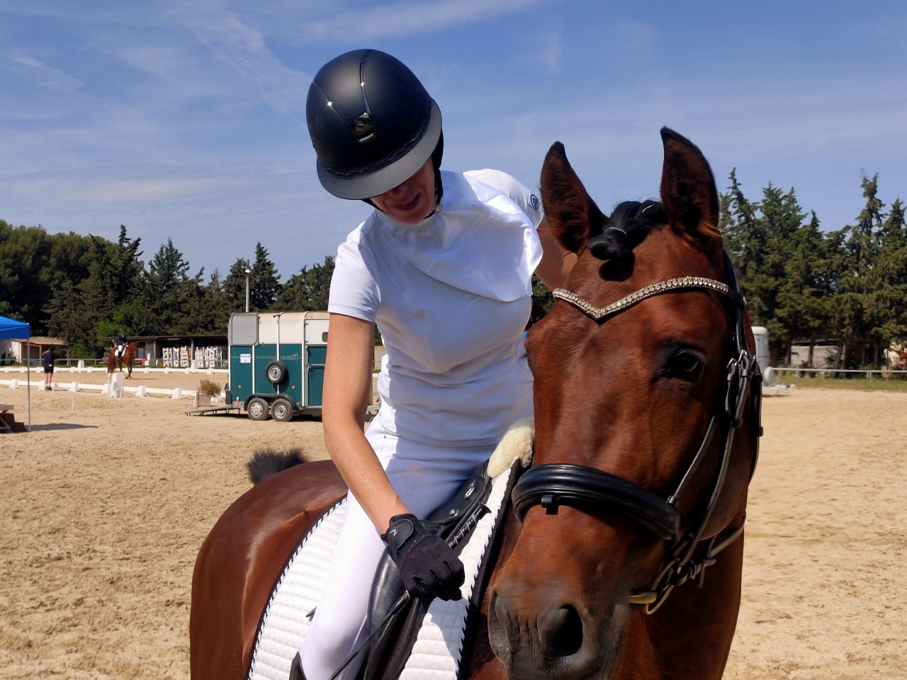 | Dire merci | Bon, je pars, je l’ai très bien sur le contour de piste, je fais une petite transition trot-pas-trot, ça va check list tout va bien. Donc on rentre, pas mal, pas vite, pas lent, nuque en place. Arret bien sauf que je le laisse regarder avant de saluer (on m’y reprendra pas) donc j’ai droit a un « s’ouvre sur l’arret » alors qu’en fait oui il s’ouvre mais parce que je pensais pas à mal bref. Départ bien au trot. Petit coté, se contracte, et là je perds mon cerveau « où commence ma diagonale ???? » donc évidemment je mets pas l’épaule devant donc rectitude pas top. Trot moyen : trop vite, mais je sais pas encore allongé sans augmenter la vitesse, disons … pas tout le temps ! Bout de diagonale y a une grosse cahute avec une grosse banderolle qui fait flop flop flop au vent donc il sort les aéros frein et je peux pas me servir du petit coté pour le remettre bien avant l’eed vu qu’il est terrorisé par le petit coté cahute et que je suis juste en train d’essayer de le garder droit… Première eed, pas mal notée 7,5 Petit coté, j’essaie de le un peu grand Première tete au mur, il fatigue déjà et vandalo quand il se fatigue, il se ferme bien sur ! donc je bricole pour le remonter et l’ouvrir mais j’ai plus de jus et le postérieur droit écrasé par la tete au mur donc j’en chie. Deuxième trot moyen 7, trop rapide Les deux autres eed et tete au mur : 7 Ca me met les boules, on peut tellement faire mieux sur ça. Grosse déception sur mon pas, un juge l’a vu latéralisé, moi pas. 5 l’autre le note a 6,5 Travail du galop, rompre le contact, là c’est pour ma pomme, j’avance pas assez longtemps les mains… alors que c’est quelque chose qu’on fait très bien. Par contre bonsoir la rectitude, j’ai honte, on dirait un galop 2. Il a les hanches dedans sur tous les départs c’est vraiment abusé. Donc un juge a très mal noté le travail au galop entre 6, voir 5 parfois, l’autre est plus conciliant avec un global de 7. Mon dernier doublé arret est très mal noté a 5 par R, alors que l’autre me note a 8. J’ai eu l’explication : j’ai oublié de saluer le jury et j’ai félicité Vandalo avant. Il m’a dit que c’était une grosse faute. Ouai bon une faute comme ça, bref… c’était peut etre pas la peine de sanctionner 3 fois. On va dire que c’est le facteur humain bref. Au global, je ressors contente car pas de grosses grosses fautes, il n’est pas sorti du carré, il n’a pas tapé les lices, mon tracé est plus net, Mais : je l’ai laissé se baisser et s’enrouler, j’ai pas monté mes foulées, je suis encore très loin de ce qu’on sait faire. The result : 3 ieme avec 64% |