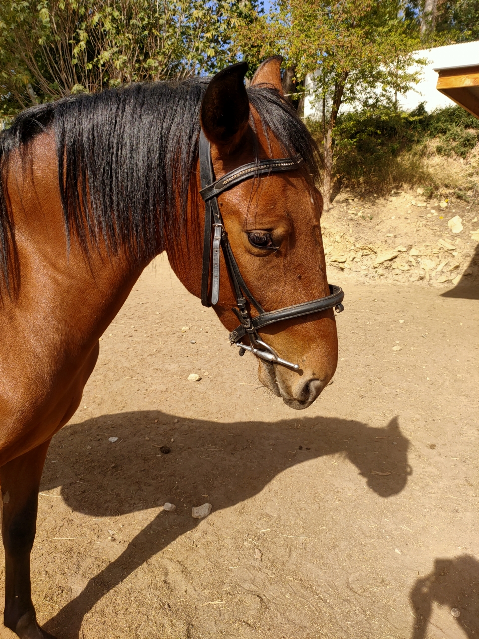 ) car du coup le montant du filet passait devant celui de la muserolle donc le mors étant tout écarté...