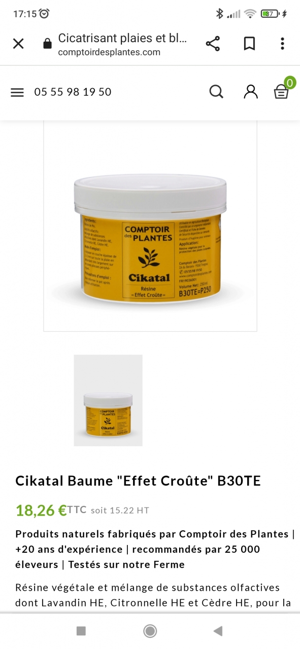 | Dire merci | dans ce que je voulais acheter "pour voir" à la fin de mon pot y avait le narjeli, "ton" cicaseptive aussi. Hier soir j'étais blasée, Takhan jusqu'a présent était relativement indemne, là je regarde sous la couv, il a le bide a sang, une langue de 15cm sur 4 en quoi... maxi 48H. Pour V, je jongle les couvertures, la bucas l'ayant blessé au garrot (mais qui était bien car elle descendait très bas sur les membres, j'ai remis la lycra moulante, au moins elle blesse pas mais du coup il se bouffe le poitrail et le derrière des cuisses mais sous le ventre est mieux protégé... Oh joie! Ce matin je vais aller voir décath si je trouve pas le crinprotect je crois qu'il y ait. |