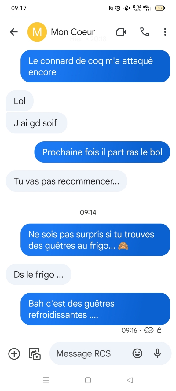 | Dire merci | Allez je vous partage un échange de texto entre mon homme et moi... Contexte, vandalo a un peu les tendons gras niveau boulet quand il fait très chaud, je me souviens que fut un temps j'avais acheté des guetres refroidissantes... donc... ![]() (ah et oui mon coq m'a encore sauté sur les jambes aussi) ![]() |