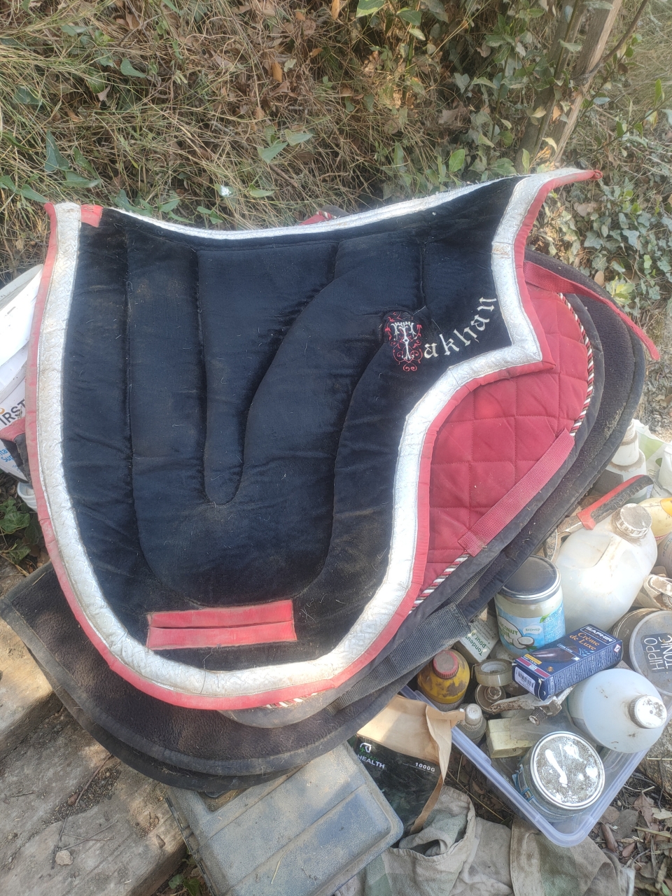 | Dire merci | ouai c'était l'époque du forum les "barokeurs" avec les brides avec les attaches bien clinquantes et les tapis en pointe ![]() Je m'en souviens comme si c'était hier, j'avais eu mon premier salaire 1120 € nets et j'avais fait la grosse folie en commandant ce tapis (à l'époque c'était quand meme pas loin de 120 ou 130 €). En revanche je dois dire que même si les souris sont passées par là les matelassures sont impec. Mais bon ... le gout est.... un peu douteux Du coup j'ai retrouvé aussi des tapis de selle mixtes (quasi neufs là aussi vestige de mes compétitions CSO avec Takhan) avec plein de strass, mes enfants se sont jetés dessus pour les prendre pour le poney. J'avoue... ça m'a fait plaisir |