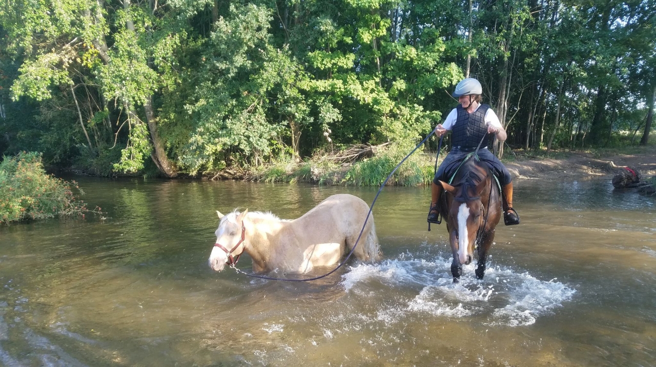 | Dire merci | Pfiou quelle semaine intense !! Beaucoup de boulot, et nous avions lancé des travaux à la maison, profitant des congès de mon conjoint, petite pause aujourd'hui pour venir vous raconter nos aventures de la semaine dernière. Donc jeudi et vendredi j'étais à Rosières aux Salines avec Gé pour mon 2e module de BFE TREC. Nous avons fais la route avec un ami qui participait aussi avec son cheval. Debout 5h, 1h45 de route. C'était un premier transport aussi long pour lui à part quand je suis aller le chercher. Les loulous ont été super sage ! Arrivés sur place, c'était un peu difficile, cloitrer dans des boxs, sans voir les copains, sans pouvoir sortir la tête.. mais il a fini par ce calmer.. Nous on est tombé des nues ! 50€ la loc du box pour 1 nuit, sans foin (5€ en supplément la petite botte), du coup nous avons trimballé notre foin. Mais surtout dans le box, pas d'abreuvoir ! Et ça on était pas au courant ... purée heureusement que j'ai toujours des seaux qui trainent dans la voiture... Bref.. Matinée en salle pour la théorie. Ensuite on ce partage les rôles, sur les 2 jours chaque enseignant anime une séance et les autres font cobayes. J'ai demandé à mes collègue de me mettre sur une séance soft, car c'est un 4 ans, tout vert, jamais sorti de chez lui etc.. Et bien je me suis retrouvé sur la seule séance ou nous avons travaillé sur les sautants ; contres hauts/bas, et tronc lol ![]() Il n'avait pas l'air trop perturbé d'être sur le grand terrain, à côté dans la carrière un attelage était au travail.. j'étais pas tout à fait sereine, mais il a été top, j'ai commencé un peu à pied, puis monté quelques transitions etc.. Puis je me suis joint au groupe, on nous a demandé de nous mettre en suspension au trot, tous sur le même cercle, ça c'était OK. Puis au galop, là c'était autre chose, il ne comprenait pas tout lol, j'arrivais a peu prêt à partir au galop, mais pas à diriger sur le cercle trop dur pour mon petit bout. C'est pas grave. On a ensuite travaillé un petit contre haut, il était déjà cuit, et c'était pas évident de trouver le rythme en maintenant la direction, on a eu un saut assez folkorique, mais il était calme et on a fini par réussir à venir au trot et faire de beaux passages. Idem sur le contre bas, ou il à hésité un peu, on à demandé a son copain de van de faire locomotive puis c'était bon, il avait compris, au pas et au trot. Et ensuite on à sauté un petit coffre au trot, où là il ne c'est pas posé de question, au top mon petit cheval ! Pour finir on est allé faire un plouf dans la belle rivière qui longe le terrain, il adore l'eau et est rentré tout seul, à jouer avec ! Du coup j'ai enlevé la selle, et l'ai donné en main à une autre cavalière qui l'a emmené dans l'eau pour qu'il joue tranquillement et il c'est couché |