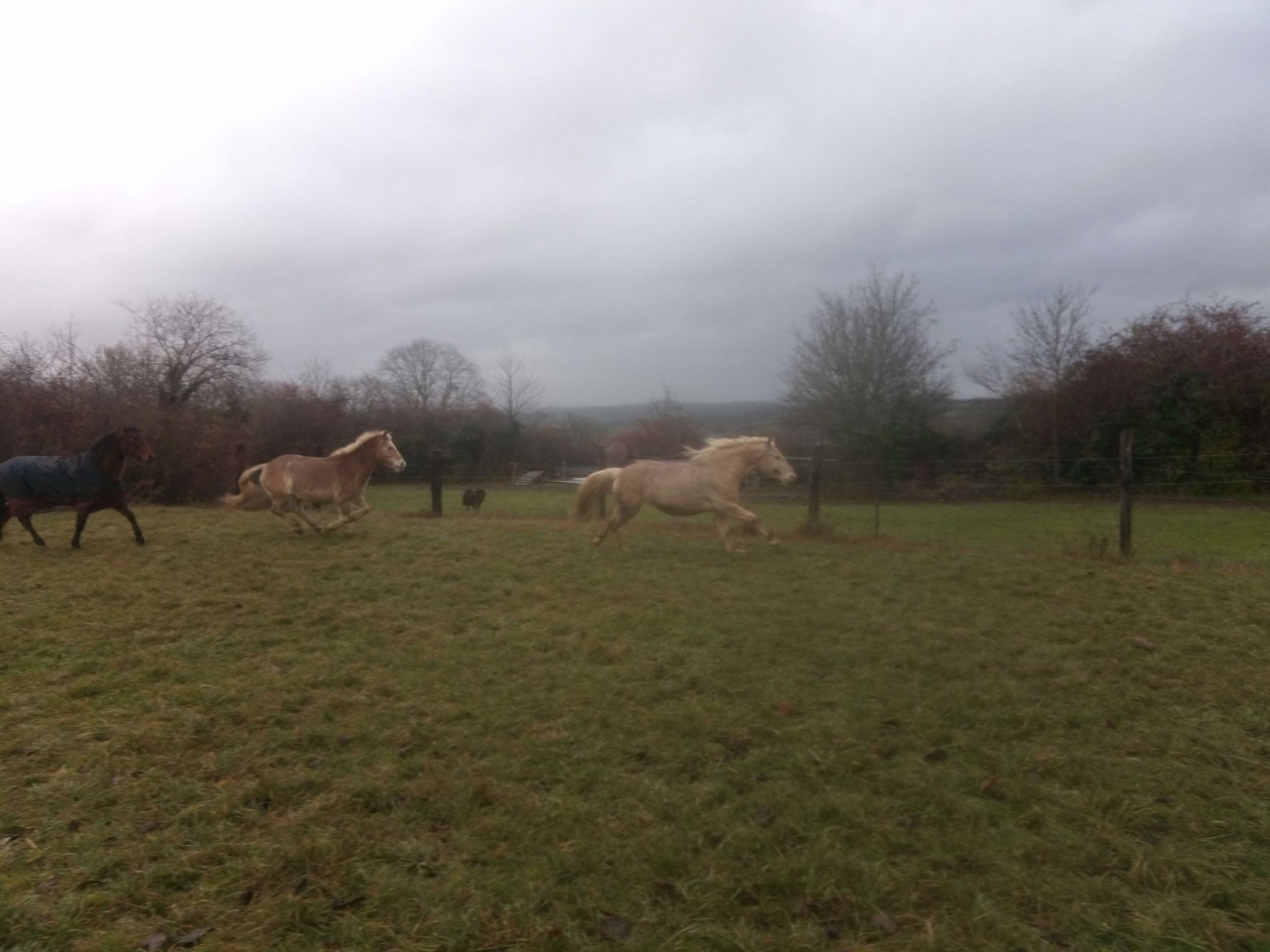 | Dire merci | Ici on a pas fait grand chose, il a fait très moche et pas mal froid, pluie neige boue... Aujourd'hui lâché de fauves dans la prairie d'à côté, ils étaient joyeux !! Et après petite balade en main avec pause broute broute. Peut être petite séance en carrière samedi après midi si météo ok et si mon torticolis me laisse tranquille |