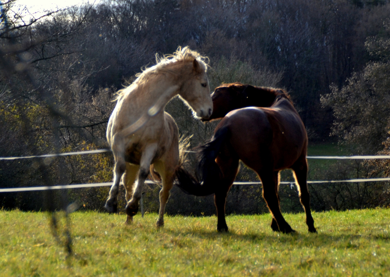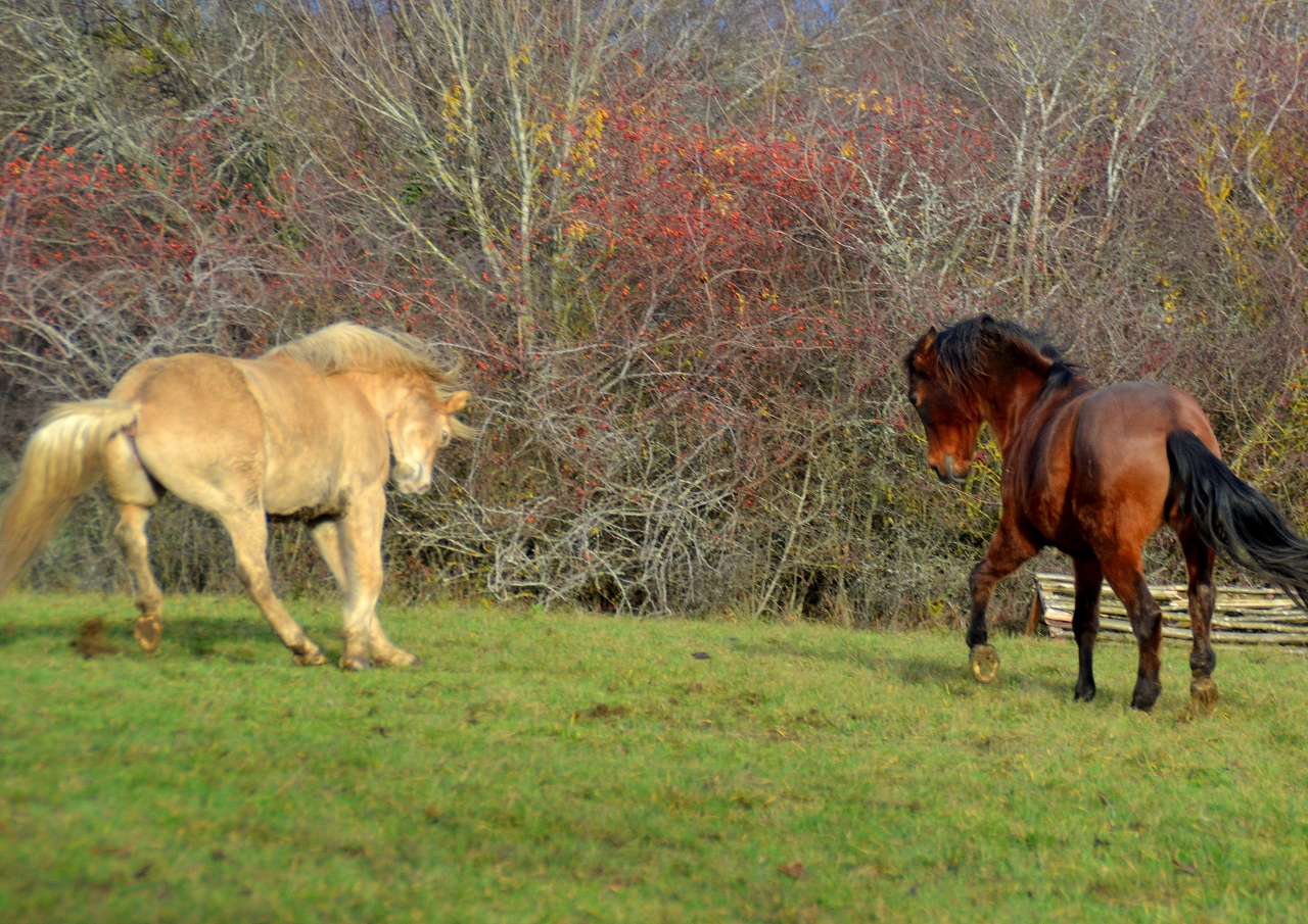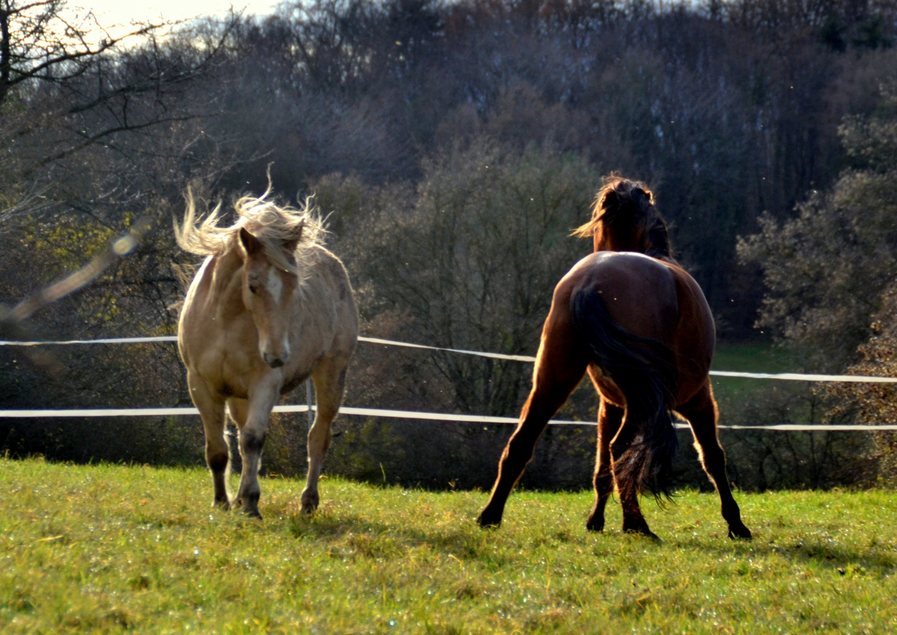 | Dire merci | k.zel n'est-ce pas ? Du coup je lui ai collé une imper sur le dos histoire de pouvoir au moins décrasser la bête quand la météo me permet de monter ![]() Hier petite balade avec une copine et sa jument arabe. Petit poney était azimuté ! Trop content d'avoir quelqu'un avec qui ce promener. Il était gentil et sage mais super tonique on à marché a une vitesse la petite arabe suivait au trot ! On a fait un petit bout de chemin au trot, où il a eu droit à l'explication qu'on peut trotter doucement sans tirer sur les rênes ,et par la même occasion mettre les épaules devant les hanches pour monter le dos. Il n'était pas trop d'accord au début, mais il a compris et a finit par se tenir. On a même fait quelques cessions à la jambes au trot d'un côté à l'autre du chemin, il devient plus léger dans la main et dans la réponse à la jambe. J'ai contacté une enseignante indépendante spécialisé dans le dressage, je vais voir avec elle si on peut mettre une séance en place tous les 15 jours pour commencer à travailler pour de vrai avec le bonhomme, j'ai hâte ! Et courant Janvier le commercial de Forestier va venir faire un essai. Est-ce que l'une d'entre vous à déjà fait venir forestier ? Sinon, j'ai enfin traité les photos que j'ai faites du 16 décembre où nous avions eu un peu de soleil ![]() Trop content de pouvoir bouger un peu ! ![]() ![]() ![]() ![]() ![]() Vous connaissez le cheval sans tête ? ![]() J'embête les papis ![]() ![]() ![]() ![]() ![]() ![]() A fond les manettes ! ![]() ![]() ![]() Mes beaux garçons ![]() |
