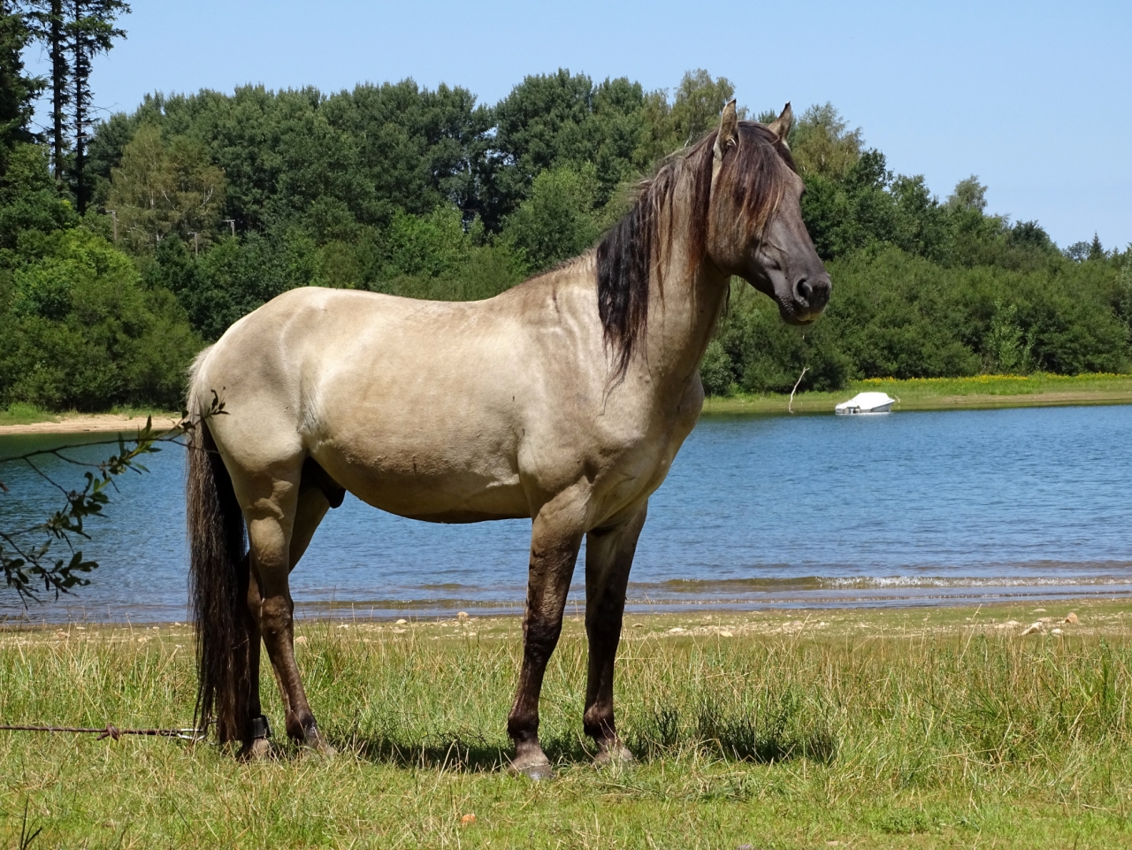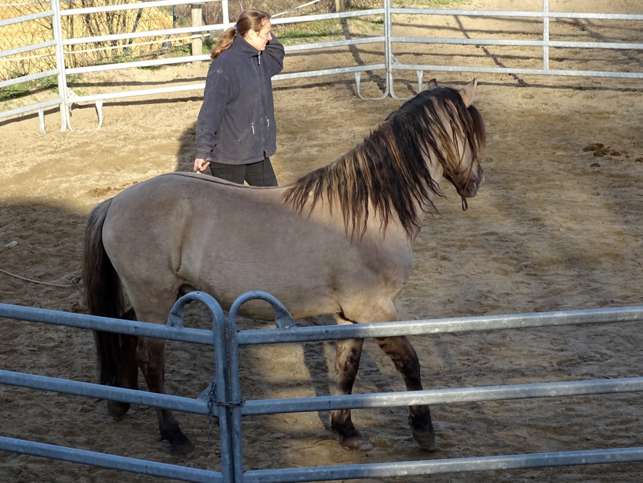| Dire merci | lsan il y a plusieurs races. Les juments grullo sont des konik polski, race polonaise qui est une tentative de reconstitution du tarpan sauvage, disparu au début du XXe. LA mère, Niagara, est pure race, sa fille Aiko a un peu de sang Sorraia (autre race primitive, mais située au Portugal, ancêtre du lusitanien). Feenouic, c'est un gros mélange : 37.5 sorraia, 12.5 lusitanien (donc 50% portugais), 37.5 konik polski et 12.5 welsh. Jeizai est un jeune étalon pure race kabarde (Caucase, Russie). |