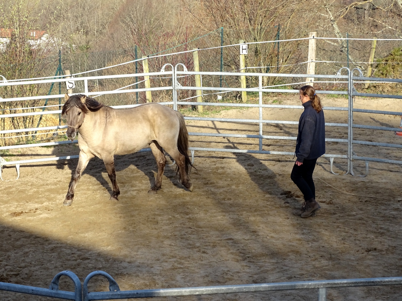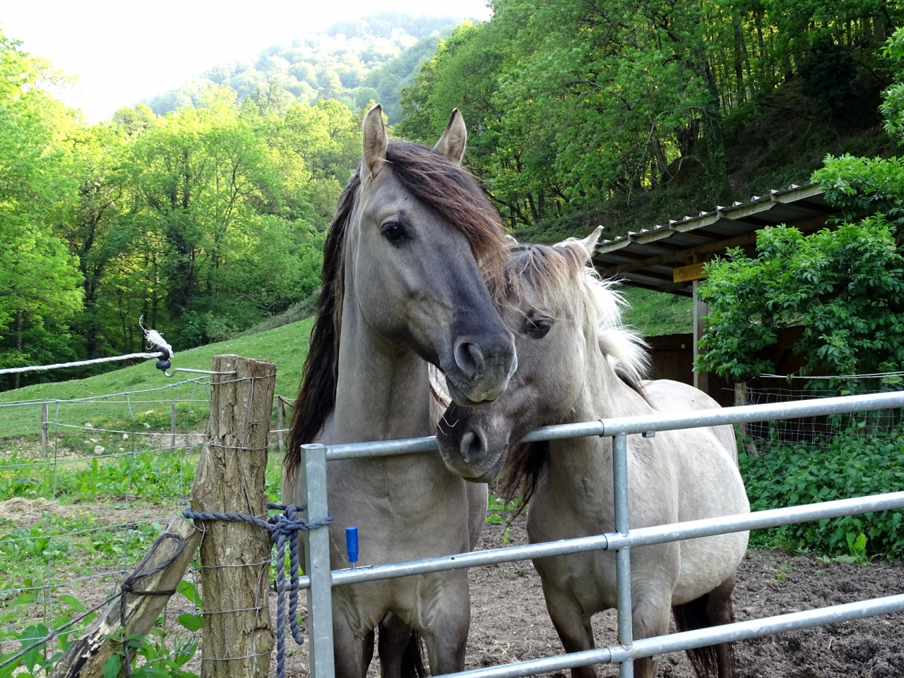 | Dire merci | ... souris, ou autrement dit grullo, bien sûr ! 1er Janvier 2020, 6h, il fait nuit, et la route est très, très calme ! Me voilà partie pour notre nouvelle aventure, deux juments konik polski (ONC, comme la plupart en France ) qui m'attendent dans le Gers. De quoi souhaiter la bonne année à ma famille avec de la couleur dans le van !Retour quelques jours en arrière, où nous fêtions Noël à Toulouse, et qu'au retour, nous faisons un petit détour par Mirande pour y voir ces deux ponettes, trouvées sur Lebonfoin. Prix dérisoire (je ne sais même pas si c'était celui de la boucherie), aller, on y passe juste pour voir, pour ne pas regretter de n'y être pas allés. Mais là, on tombe sur deux ravissantes ponettes, aplombs pas mal du tout, bon dos, plutôt joli modèle pour la race ! La maman, Niagara, 11 ans, a quand même une croupe très "konik polski", un peu plate et assez peu gracieuse. Le reste est très, très convenable. La fille, Aiko, 75% konik polski, 25% sorraia, est plus fine, avec une croupe plus ronde. Moins typée que sa mère. On tente quelques allers-retours en licol pour voir les allures, pas facile de les faire aller droit ni de leur prendre les pieds. Bon, RAS, ce ne sont pas des allures de chevaux allemands de dressage, certes, mais c'est plutôt bien. Bon, et puis, on ne va pas se mentir. La réalité c'est qu'elles nous ont tapé dans l’œil, et surtout dans le cœur. Entre Niagara qui faisait des freu-freu à notre fille de 5 ans dès qu'elle s'en éloignait, et Aiko qui faisait du charme à mon mec, elles nous ont mis d'accord. Alors voilà, affaire conclue. Deux portraits en sortie du van, jour 1 (1er janvier 2020, donc !) Aiko ![]() Niagara ![]() Après quelques semaines avec nous pour faire connaissance, les pré-débourrer (monter dessus à l'arrêt, aides de base au pas), les vacciner, on les a envoyées en montagne, qui sera leur habitat à l'année, sauf pour les mises bas et les saillies. Premières minutes de liberté ![]() ![]() ![]() Niveau allures, ce n'est pas St Georges, mais c'est plaisant quand même à regarder ![]() ![]() Deux licornes ??? ![]() Les modèles : ![]() |