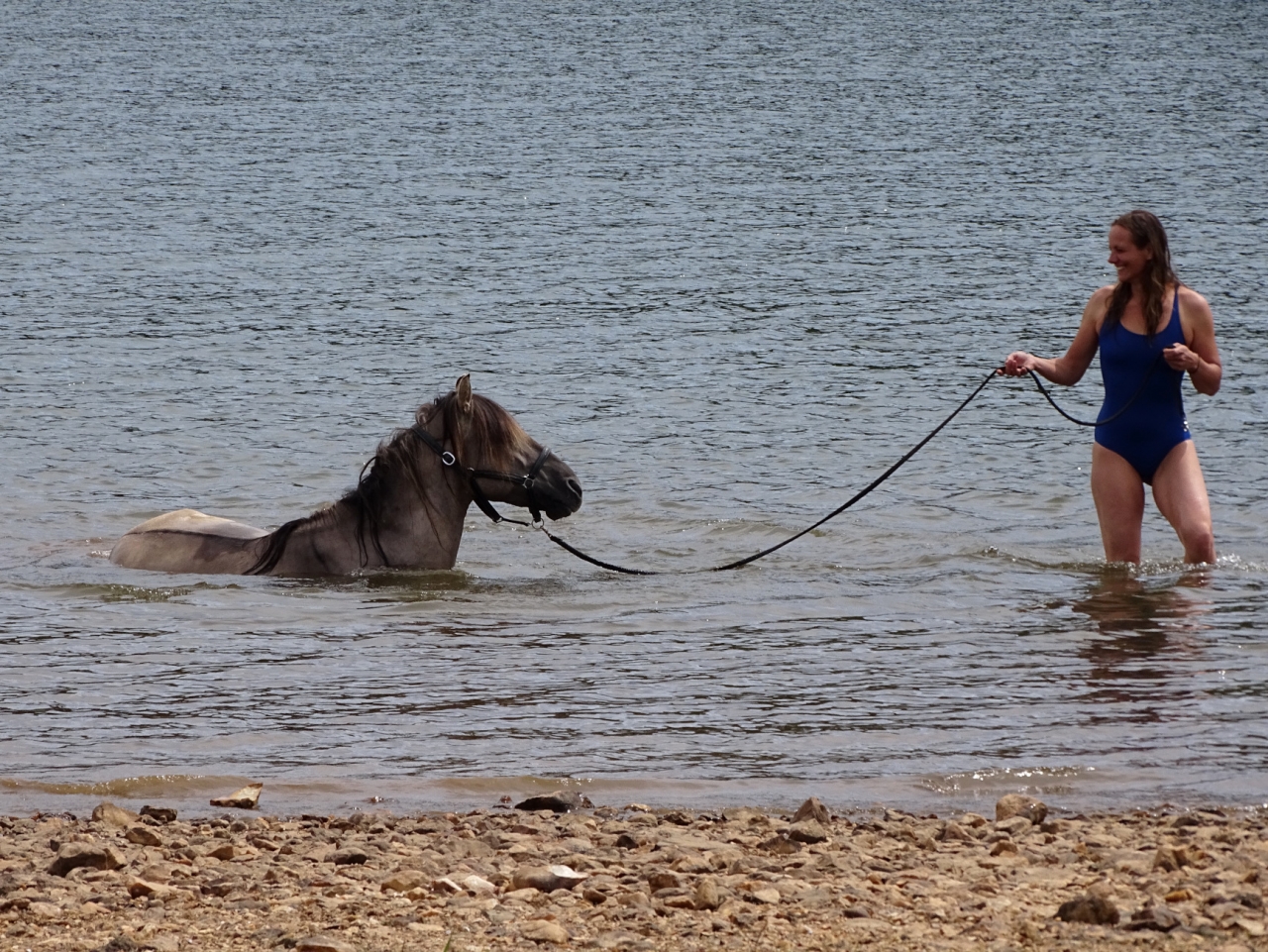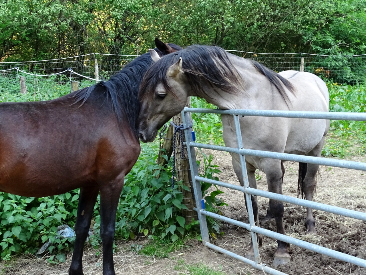 | Dire merci | Il y a des jours où avoir des chevaux, c'est dur. Et puis d'autres comme hier où c'est tellement du bonheur ! Transfert des kabardes à cru et en licol vers la lande, juments au top, qui suivent sans broncher. Puis une fois là bas, mettre tout ce petit monde ensemble (les deux garçons étant restés dans la champ, seuls et mécontents ), et après que les papotages et dernières nouvelles soient dites dans le troupeau, récupérer les koniks polski pour les amener auprès des garçons. Malgré la fille d'Aiko, Lore, qui appelle sa mère et sa grand mère, les filles suivent gentiment et Niagara m'offre même une place sur son dos, à cru en licol toujours, alors qu'elle n'avait été montée que deux fois dans sa vie et en carrière. Avec Aiko en dextre !Quelle joie (bon, je n'ai filmé qu'à la fin parce que sur une jument à peine débourrée avec l'autre qui tire en arrière sur sa longe, sortir l'APN relevait de l'acrobatie ).Une fois arrivées au champ, butox pour épouiller ces dames avant de les mettre avec leurs mâles respectifs : Feenouic pour Niagara (produit grullo à priori homozygote, faut encore que je teste Niagara pour être sûre), Jeizai le jeune kabarde pour Aiko Jeune homme à dépuceler, mais connaissant ma chaudasse,je sais qu'elle saura le faire |