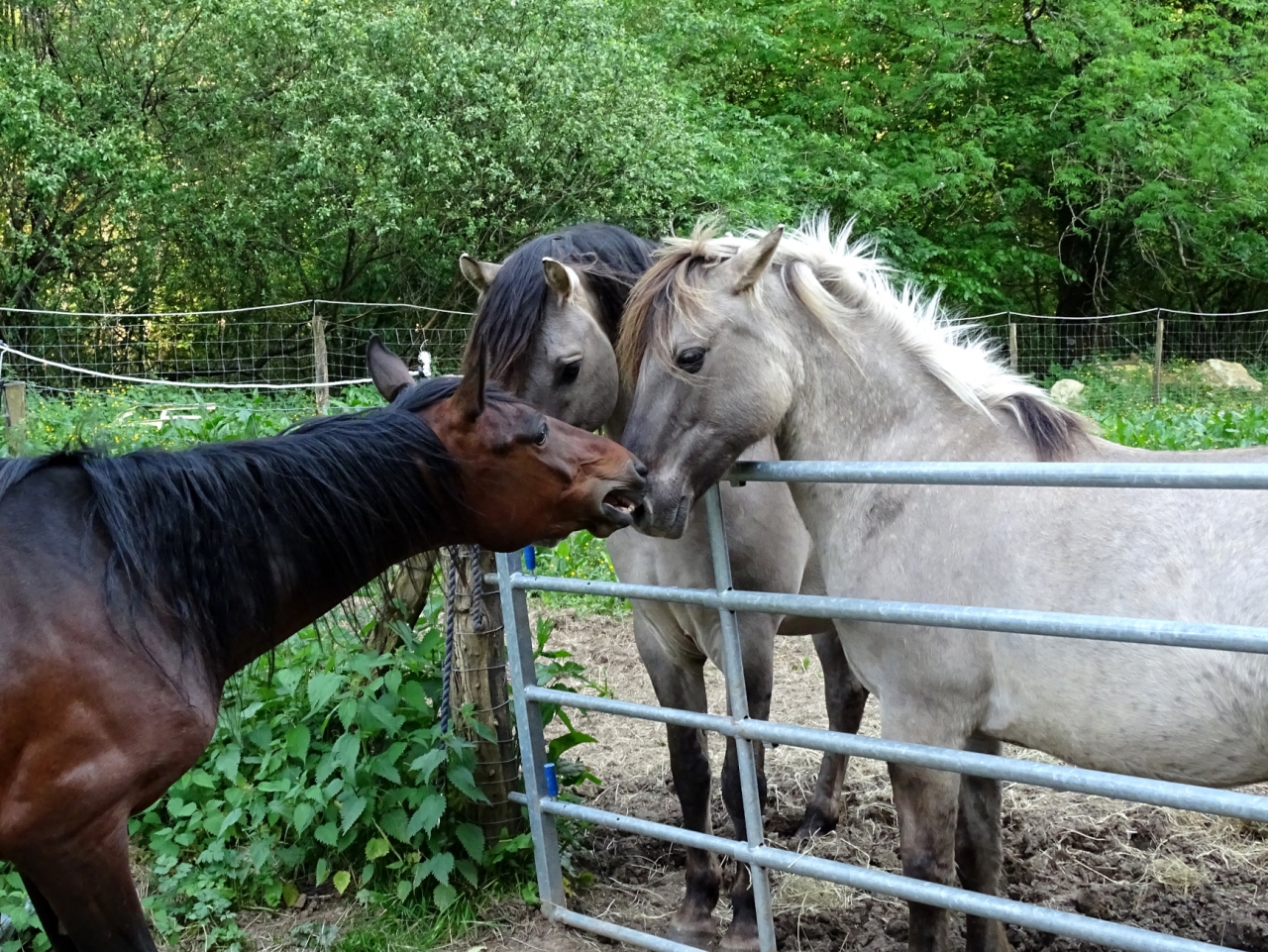 | Dire merci | Quand Jeizai se fait la malle (et laisse en plan sa jument) pour aller retrouver son copain Feenouic, et les deux étalons qui se papouillent pendant que les filles râlent... Tout va bien...![]() Niagara qui vient s'en mêler... Jeizai le fier étalon kabarde snappe... ![]() Niagara qui remet les pendules à l'heure à Feenouic... ![]() On ne s'ennuie pas avec ces bestioles ! |