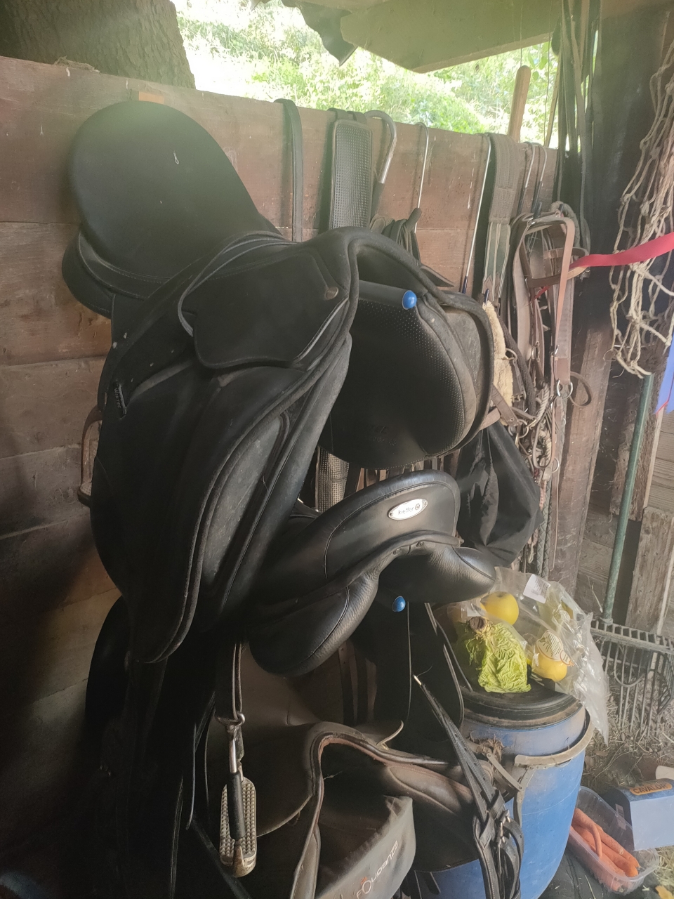 | Dire merci | Je n'ai pas de photo. Ma sellerie est dans une espèce de couloir. 4 porte selles au mur sur deux hauteurs. Filets sur les portes filets près des selles. Je range tout le reste dans des boîtes en plastique par catégories pour éviter poussière et souris, et dans des caisses pour ce qui ne craint rien. Je range les boîtes et caisse sur des étagères métalliques de recup. Sur le mur d'en face, il y a quelques tiges métalliques plantées dans le mur en hauteur pour suspendre manteaux (sur cintre), couvertures etc |